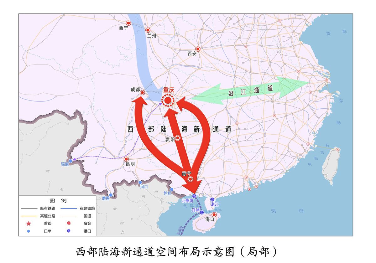破局关键之一,便是2019年上升为国家战略的西部陆海新通道。主通道由东、中、西三条通路组成。东线是自重庆经怀化、柳州至北部湾出海口;中线是自重庆经贵阳、南宁至北部湾出海口;西线是自成都经泸州、黄桶、百色至北部湾出海口。