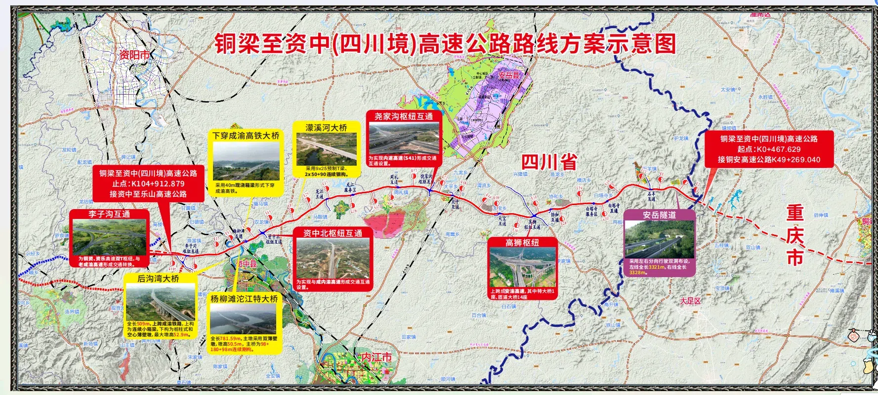 铜资高速项目路线起于安岳县石羊镇,与铜梁至资中(重庆境)高速公路对接,经安岳县、资中县,止于资中县鱼溪镇,与在建的资中至乐山高速公路相接,路线全长105公里。全线采用双向六车道高速公路标准建设,设计速度120公里/小时,总投资202亿元。