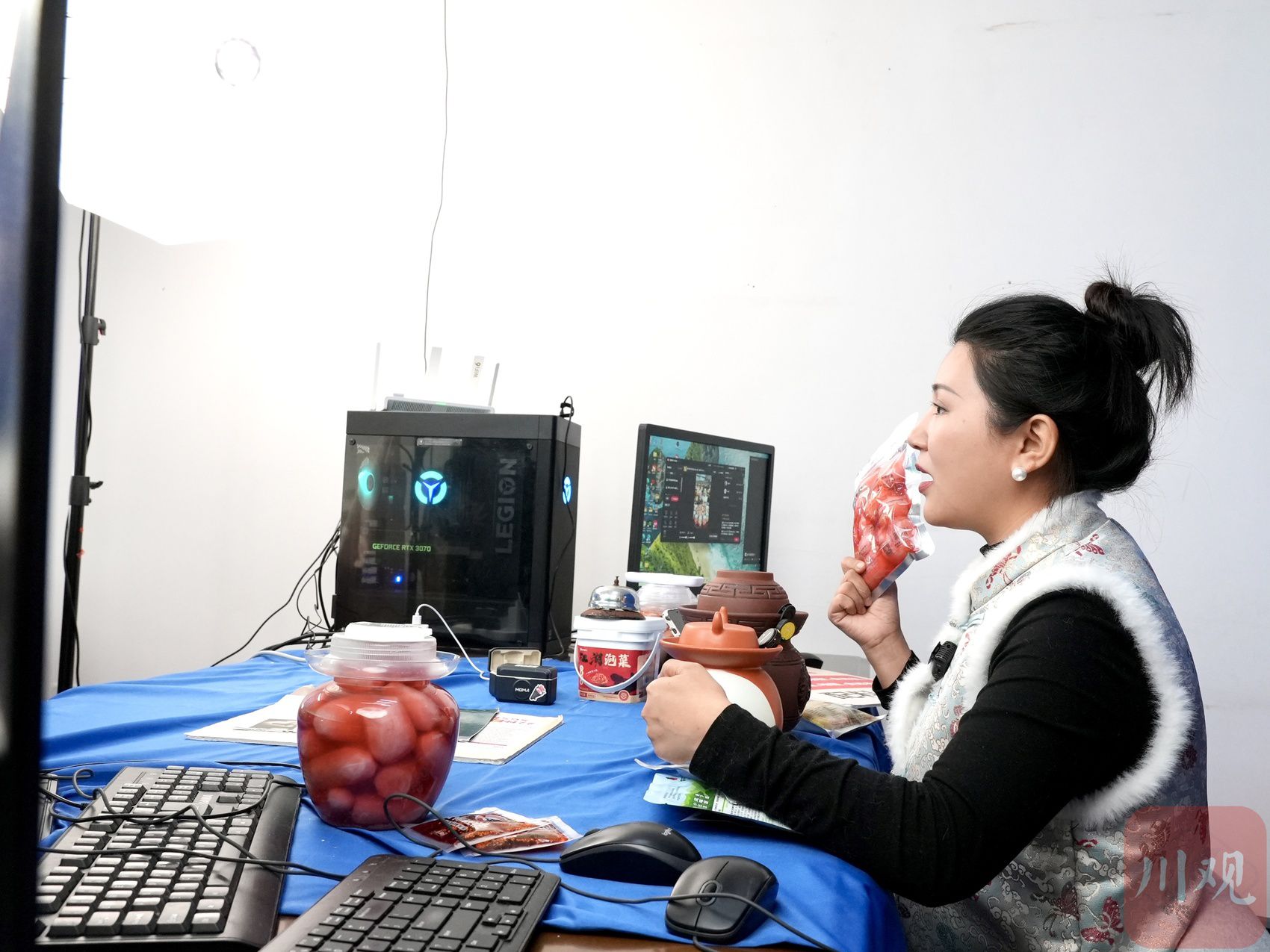 “人、货、场合一,唠家常。”面对从零开始的女孩们,这是庞思洁“教材”中的重要内容。在森牛家的直播间,主播一律盘着头、穿着盘扣马甲;庞思洁出镜拍视频时,也经常素面朝天。“土”泡菜、“土”直播,精准吸引喜欢“乡土味儿”的消费者。