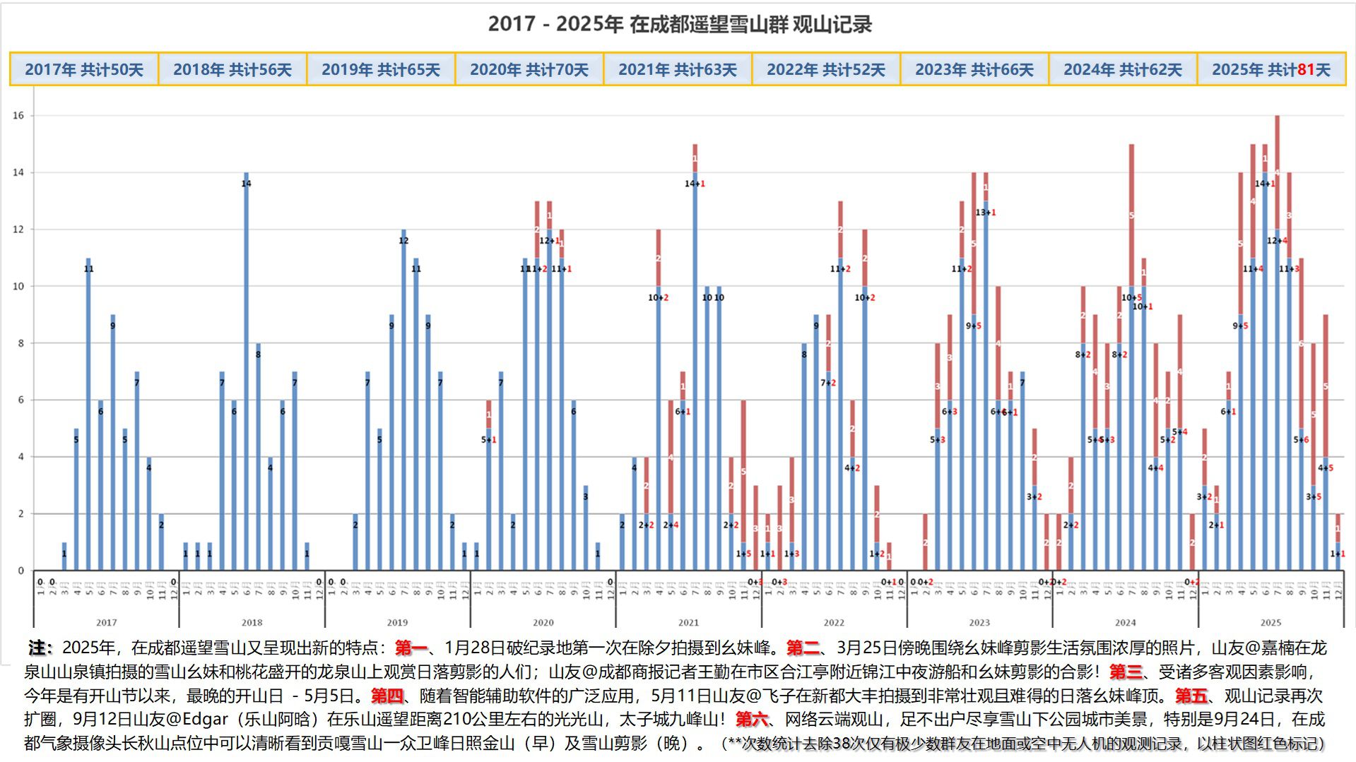 此外,2025年,在成都遥望蜀山之王——贡嘎及卫峰共有13次,这一数据与2024年持平。其中,上半年5次,下半年8次。