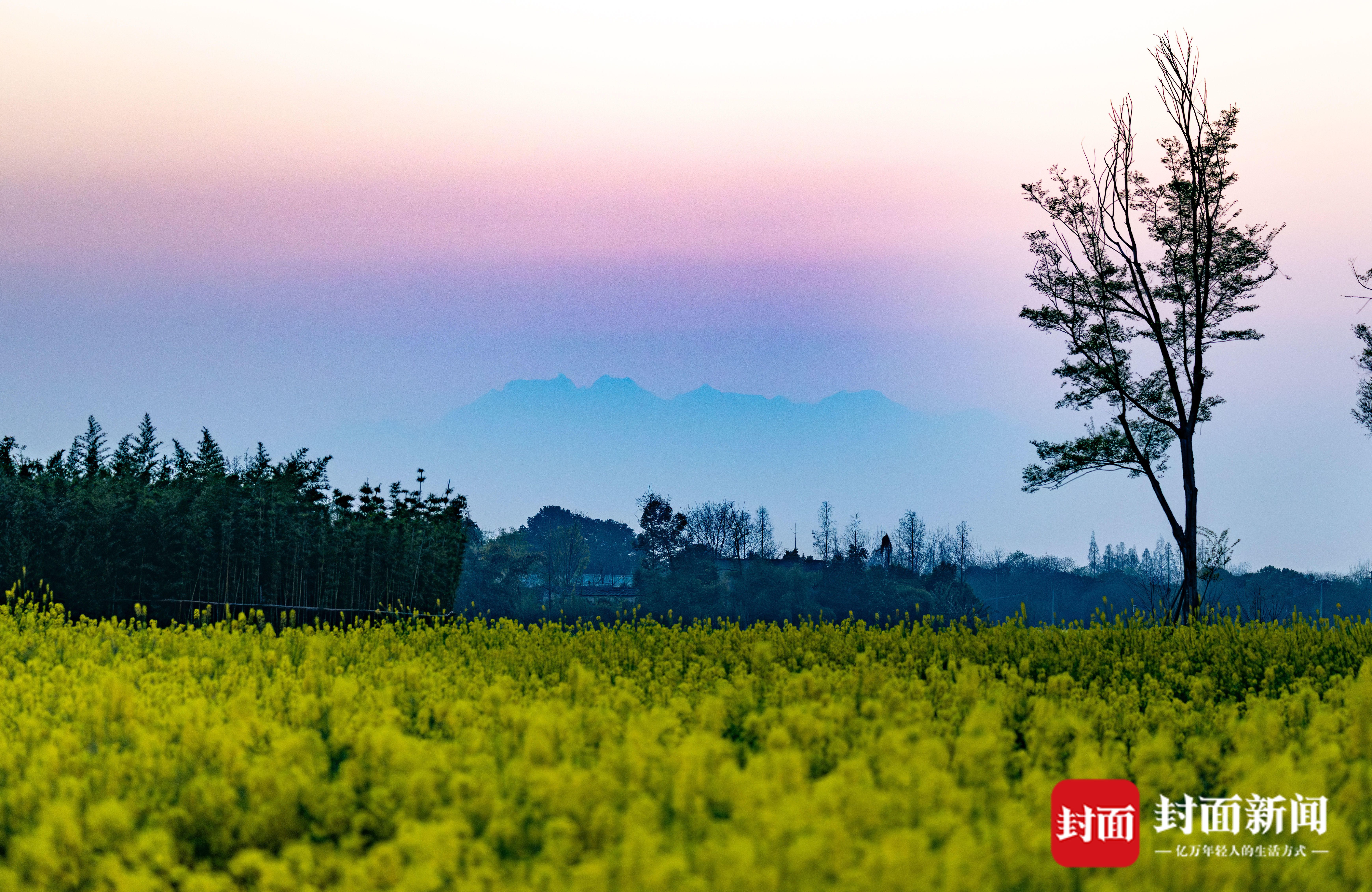 2025年3月25日,成都绕城绿道,油菜花里山影。 杨涛 摄