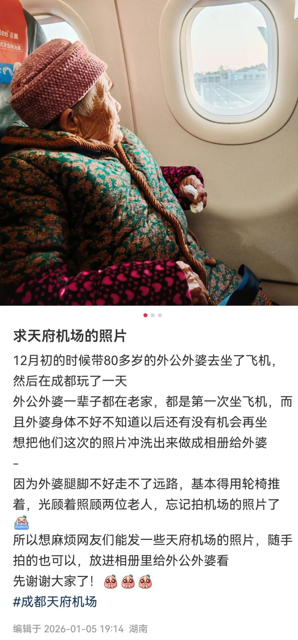 这位网友表示,她想为外公外婆制作一本纪念相册,希望大家能分享一些天府机场的“随手拍”,弥补这个旅行小缺憾。