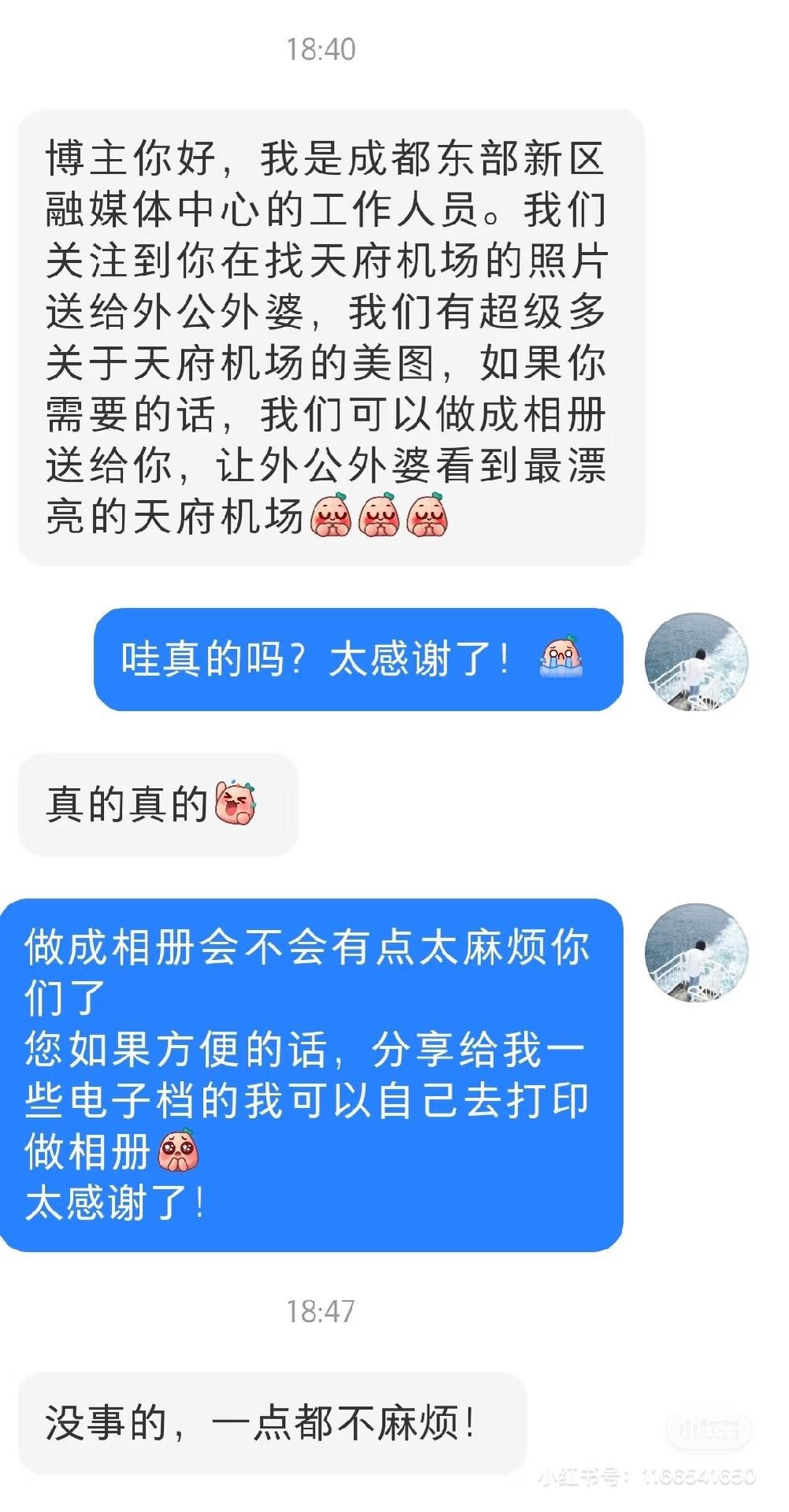 随着帖子热度上升,连成都东部新区融媒体中心也关注到了这份心意,工作人员主动私信联系博主:“我们这里有很多机场的高清美图,如果需要,我们可以直接制作成相册送给您。”
