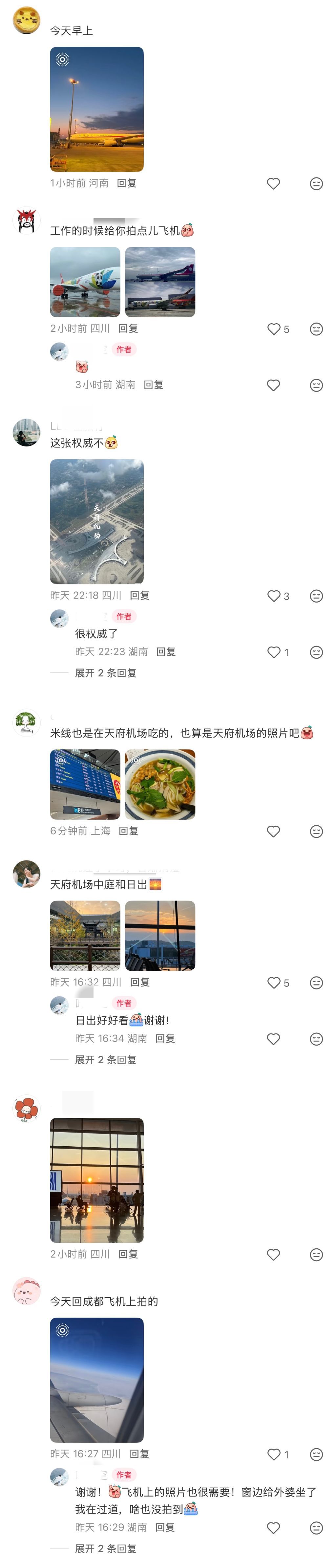 令人感动的是,帖子发出后,迅速收到了众多热心网友的回应。大家纷纷晒出自己手机里的天府机场随手拍。📸