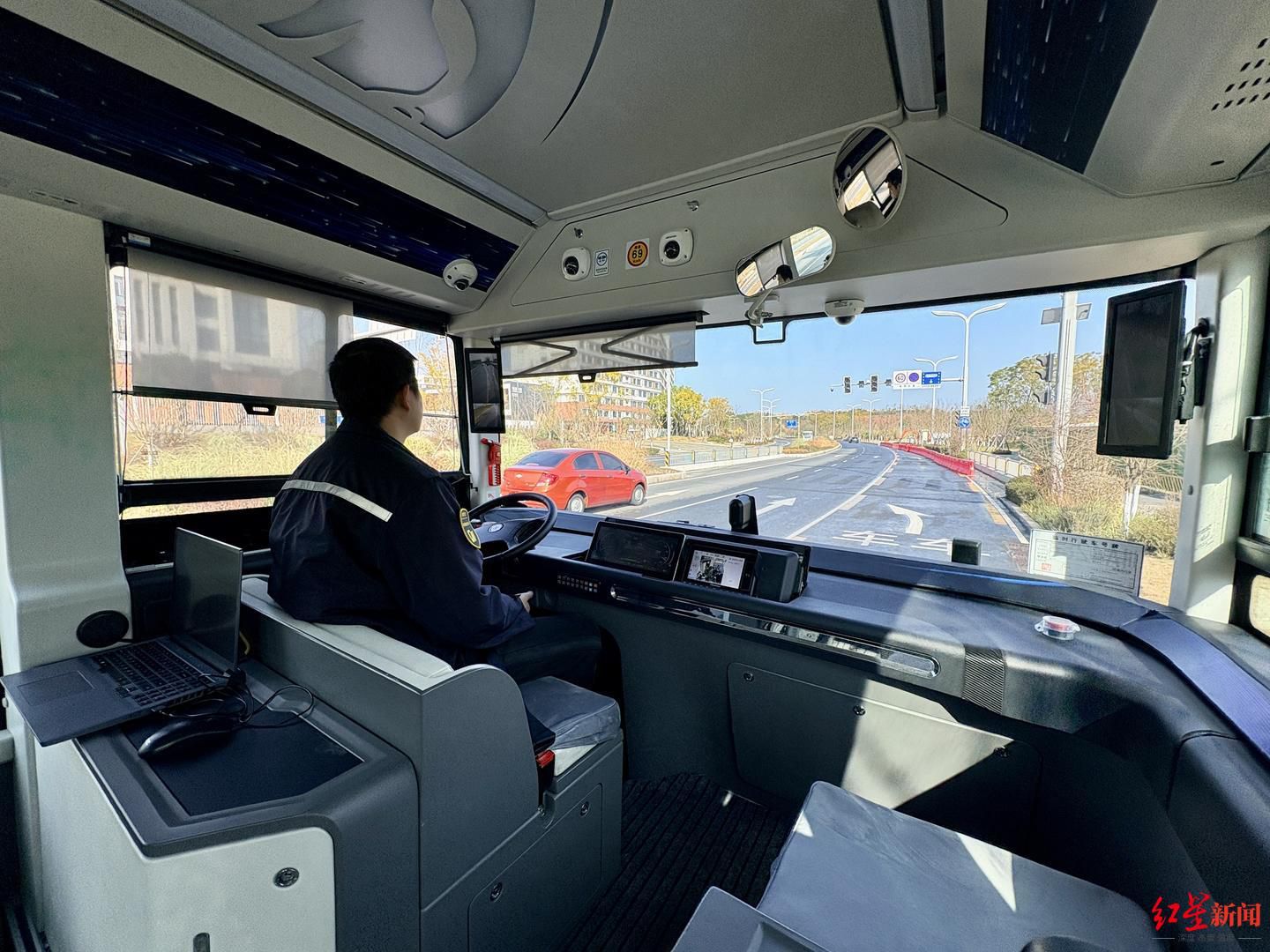 等到下午2时,一辆紫色涂装的小公交车,缓缓驶入始发站。第一眼看,这辆车驾驶位也坐了“司机”,与普通公交并无太大区别,但上车后可以看到,“司机”并没触碰方向盘,全程由智慧平台操作。