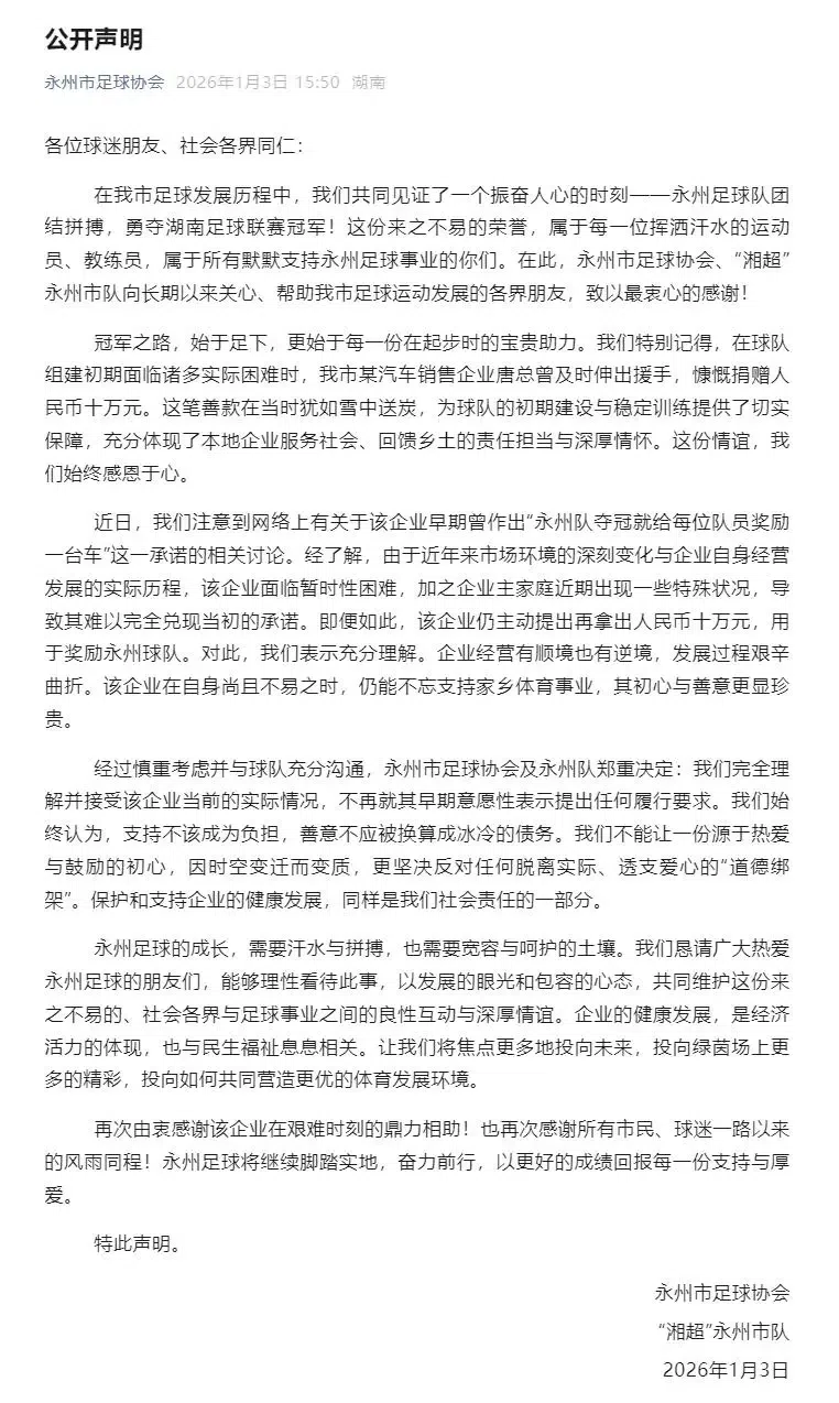 2026年1月3日,永州市足球协会、“湘超”永州市队发布公开声明,称经过慎重考虑并与球队充分沟通,不再就该企业早期意愿性表示提出任何履行要求。“支持不该成为负担,善意不应被换算成冰冷的债务”的态度,算是为这起引发广大网友围观的“送车”事件画上了一个句号。