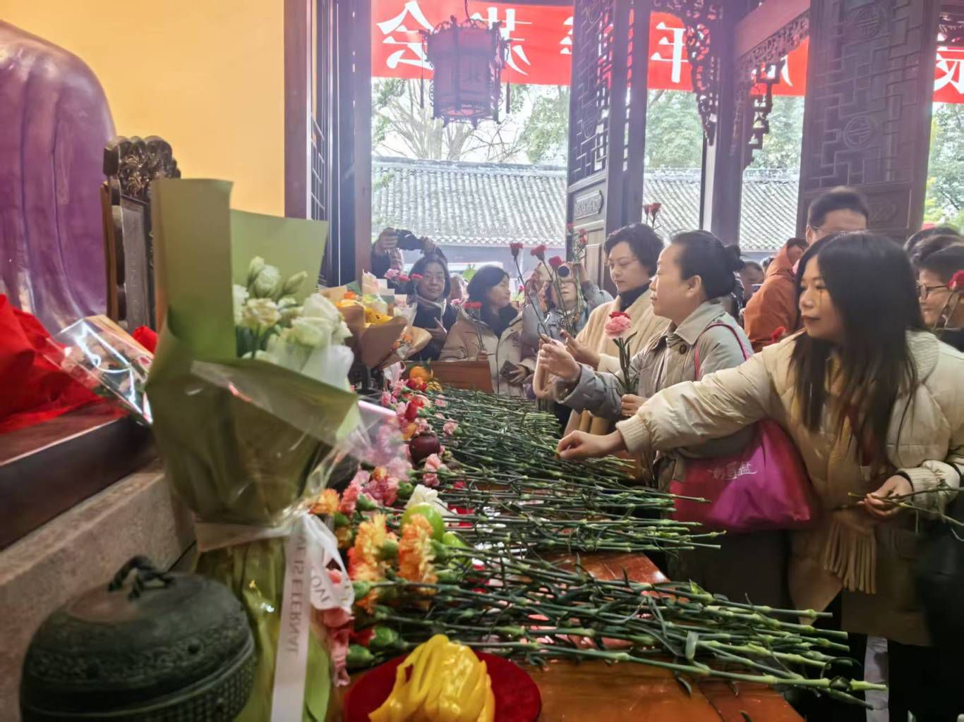 礼成后,人们将手中鲜花敬奉于殿前,有的苏粉还自制贺卡、手串等礼物郑重置于三苏雕像旁,今人的思念与敬仰,穿越时空,与先贤“对话”。