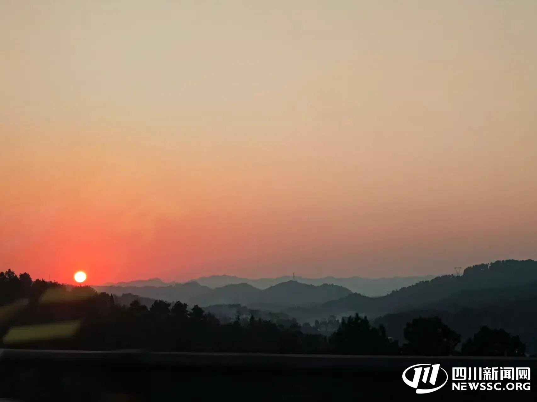 夕阳西下,从车窗边望去,延绵不绝的山脉