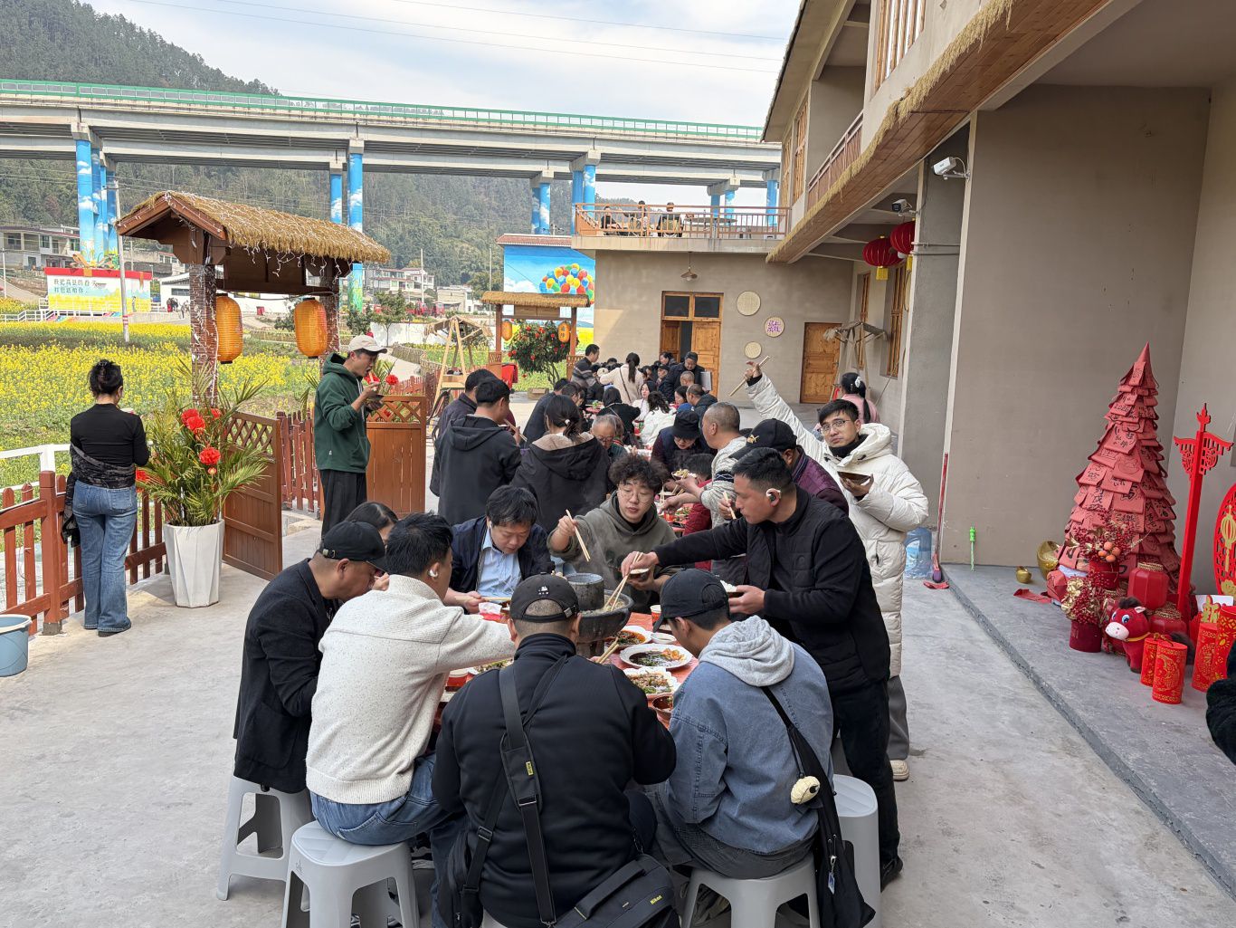 返乡大学生李皓奕正带着家人品尝地道的高县土火锅。“在外读书最想念的就是这口家乡味,能在花海边吃火锅,这种体验太独特了,年味都浓了不少!”