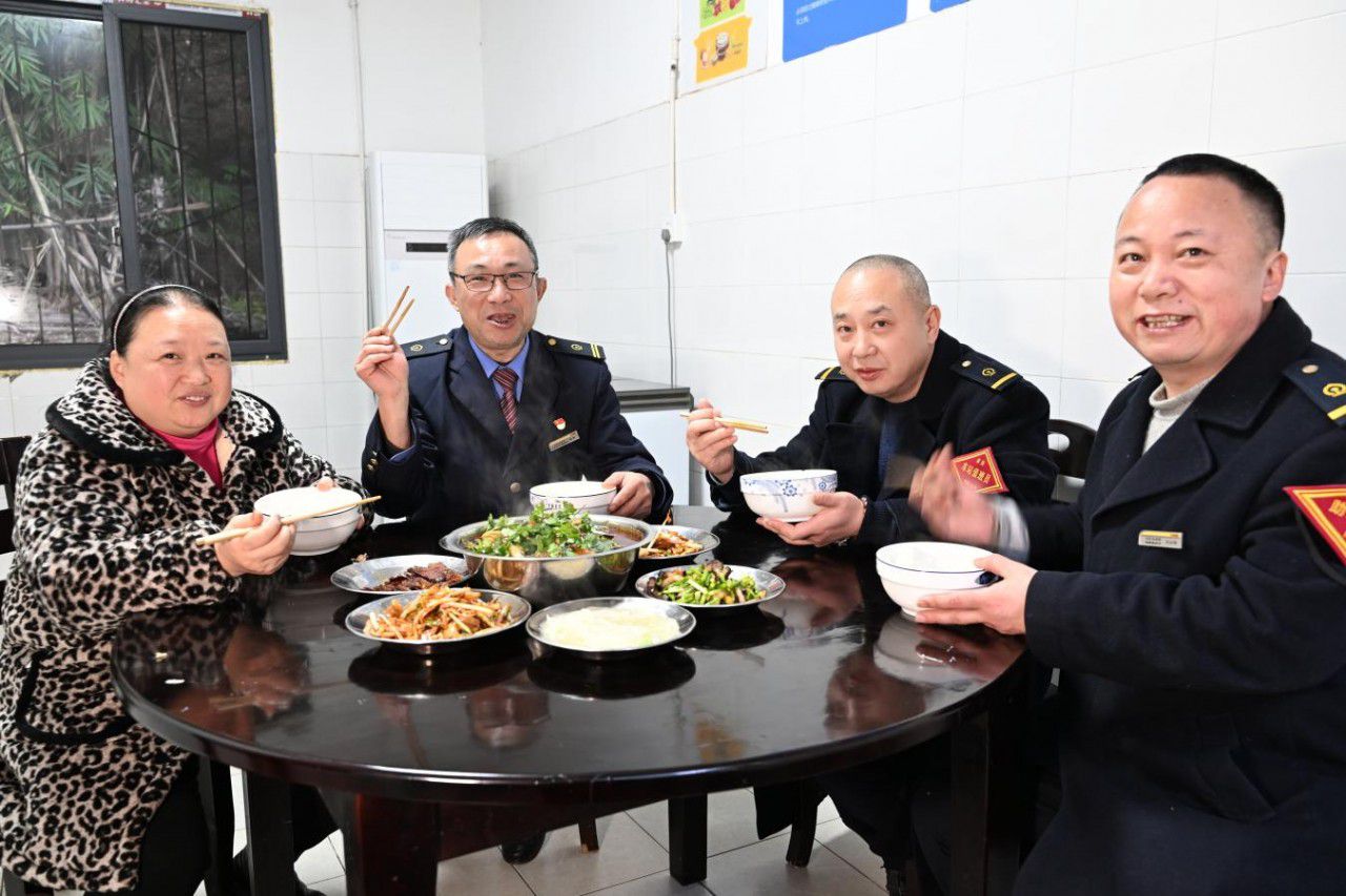 早几天,车站职工就攒着心思:有人从家里带了卤好的猪耳朵,有人买了新鲜蔬果,有人备了好喝的饮料。灶台边,切菜的、掌勺的、摆碗筷的,忙得热气腾腾。锅里的咕嘟声,碗筷的碰撞声,抢着尝味道的笑声——那一刻,是这群铁路人对“团圆”最朴素也最深情的理解。