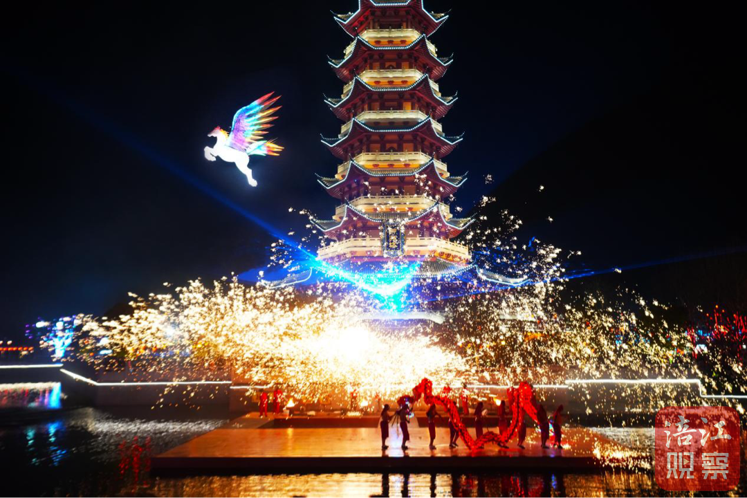 如果说白天的园区是温婉的国风画卷,那么夜幕降临后的表演则是硬核科技的实力秀场。作为全场的高潮,非遗绝技“火龙钢花”率先点燃激情。烈焰翻腾中,非遗艺师将千度铁水击向高空,炽热的铁水在夜空中瞬间冷却绽放,化作万点金星。而紧随其后的千架无人机天幕秀,则将这场视觉盛宴推向了未来维度。随着指令下达,千架无人机编队腾空,以苍穹为画布,用光束作笔墨,精准地变幻出腾龙、中国结等吉祥图腾。这不仅是一次光影的展示,更是算法与艺术的完美合谋,引得现场惊叹连连。