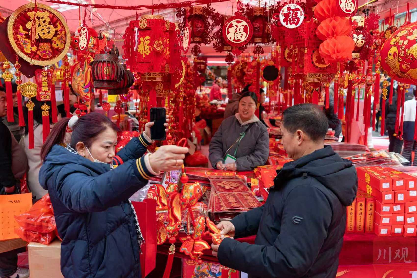 大年初二,广元武曌天街一派热闹景象。882米的唐风长街挂满红灯笼,熙熙攘攘的人群间,卖美食的、卖福字对联的、卖气球玩具的应有尽有,年味儿裹着烟火气扑面而来。田松友守着他的童装摊,货架上的红棉袄、红卫衣挂得满满当当,在喜庆的氛围里格外亮眼。