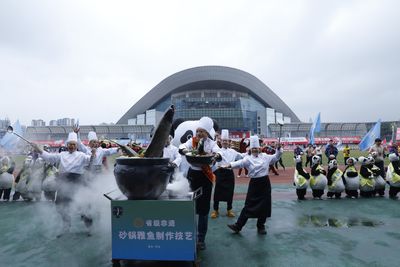 ▲省级非遗“砂锅雅鱼”现身“雅超”开幕式,为雨城熊猫勇士队的登场助阵,传统美食文化与现代体育精神在雨中激情碰撞