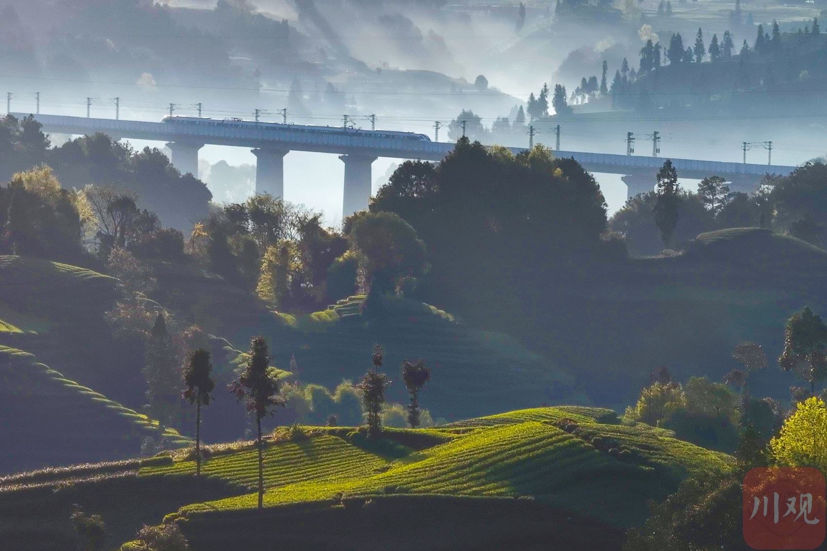 茶田氤氲着绿色,泡出的清茶沁润着四川人骨子里的安逸从容,动车折射出奋斗,跑出来的是中国基建时代的加速度。一快一慢、一静一动间,奏响了四川从“蜀道难”到“蜀道畅”的新歌。