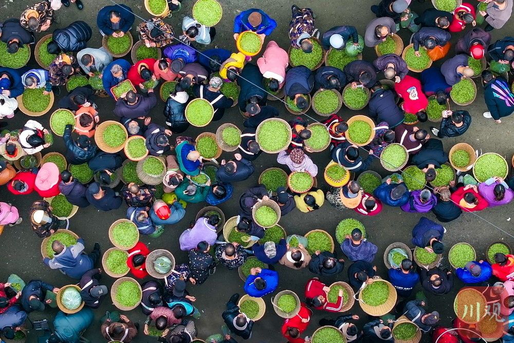 茶农正在交易的场景,俯瞰酷似“抹茶小蛋糕”。黄刚 摄