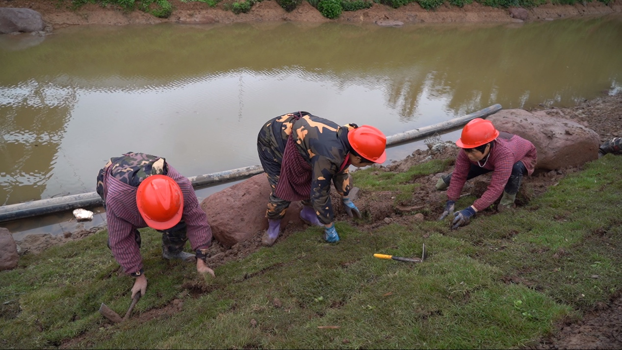 ▲工人们正在岸边进行护坡和草皮种植作业 蒋隆威摄