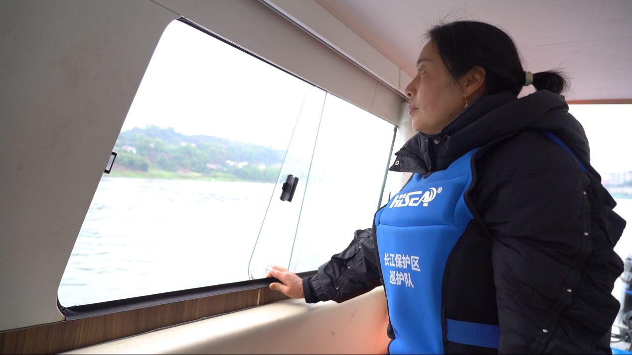 ▲正在长江泸州巡河的护渔员程晓玲 蒋隆威摄