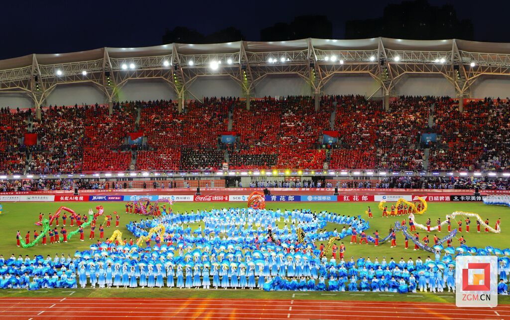 赛前,场外已是人潮涌动。一袭袭旗袍翩然走过,将盐都女子的温婉铺展在暮色中;球迷拉歌声此起彼伏,“自贡雄起”的呐喊一浪高过一浪。夜幕降临,暖场展演拉开帷幕——自贡六中与九洪中学学子踏浪而来,二十八中学生80人同步变脸定格盐都龙王脸谱,二十二中600名学子以恢弘阵型汇聚成冠军奖杯,汇东实验学校300名啦啦操队员用热情燃动全场。水润天府,戏韵流芳,青春的力量在绿茵场上熠熠生辉。