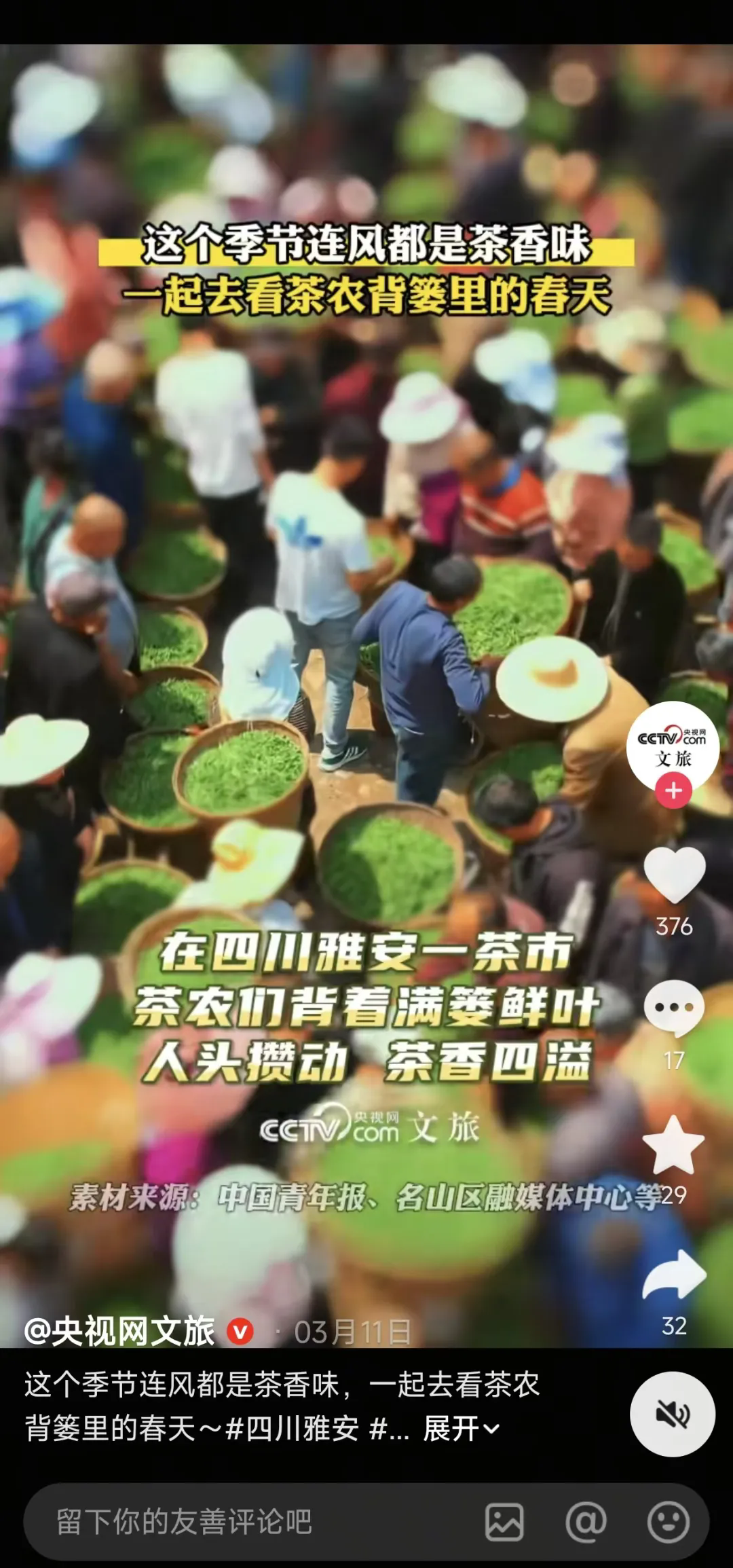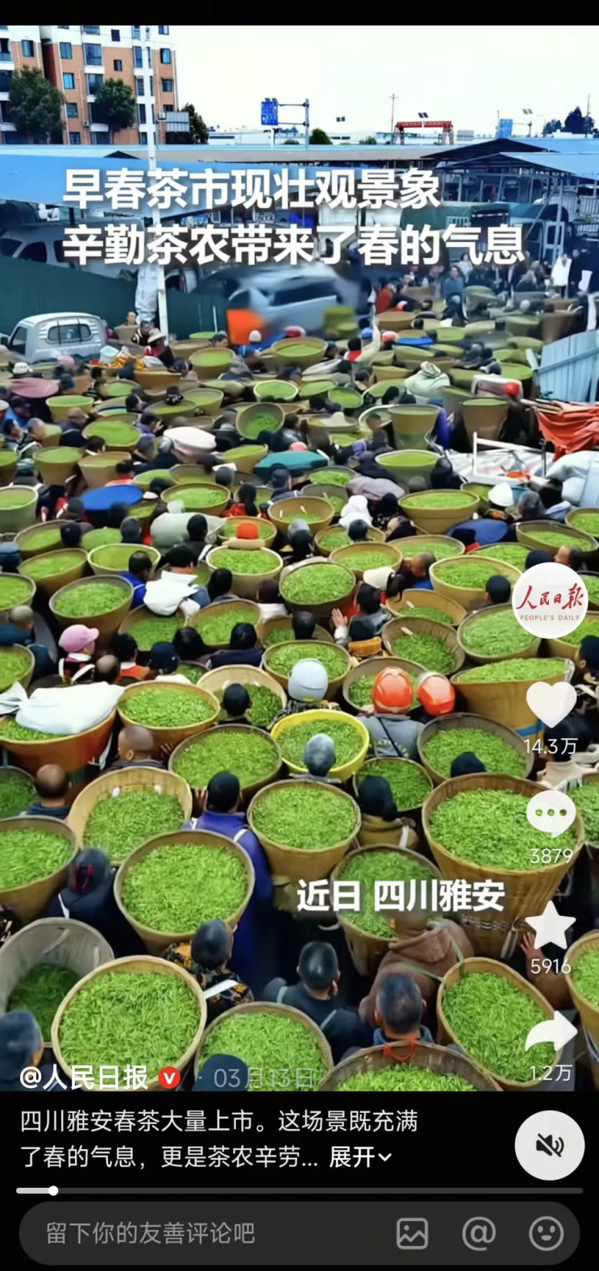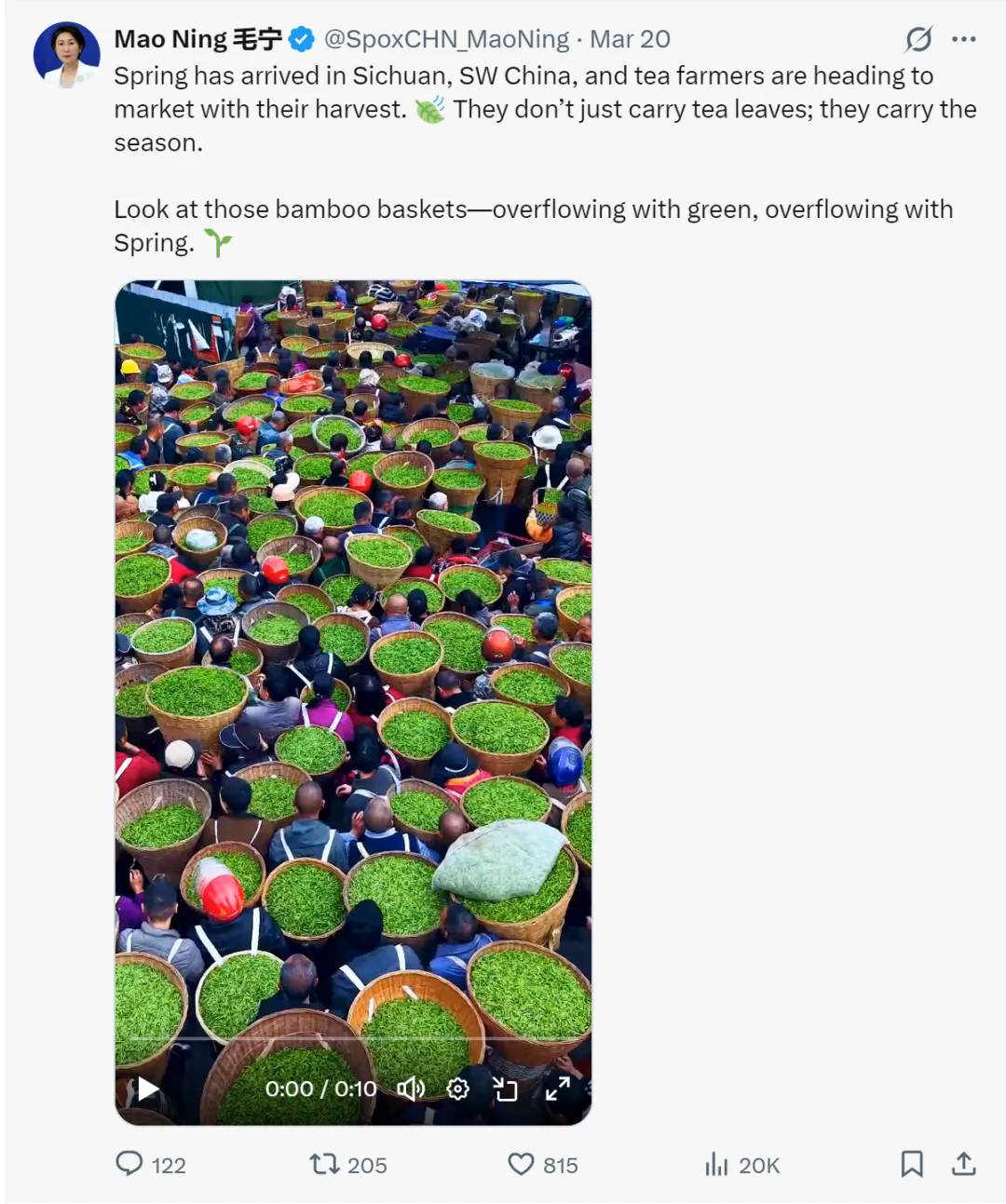高燕今年发布在抖音的视频,被人民日报和央视新闻采用;3月20日,外交部发言人毛宁在社交账号上,也转载了这条视频。从名山区红星镇的茶市,到外交部发言人的推介,雅安的春天被更多人看见。