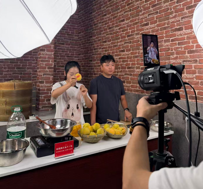 邓林(右一)在镜头前向网友推销村里的农产品。受访者供图