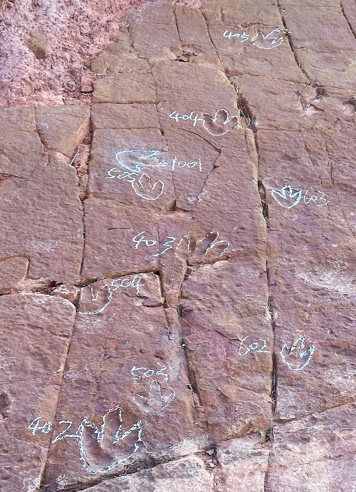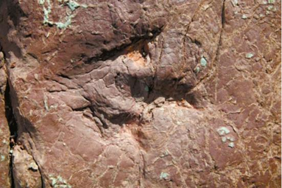 2013年2月,昭觉三比罗嘎东岸岩壁上三脚趾恐龙足迹单个拍照。