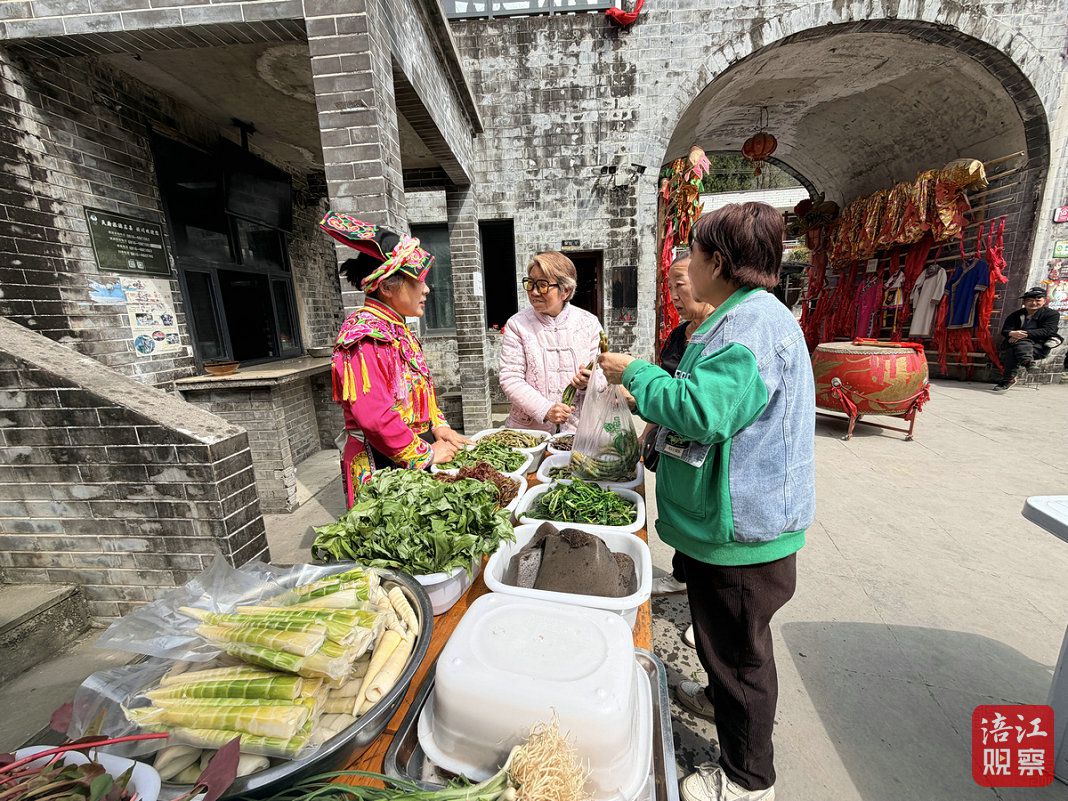 3月30日上午9点,记者走进北川石椅羌寨,寨门口一条“春日集市”已然热闹非凡。摊位沿着青石板路依次排开,还带着露水的新鲜野菜,被整齐地码在竹篮里。
