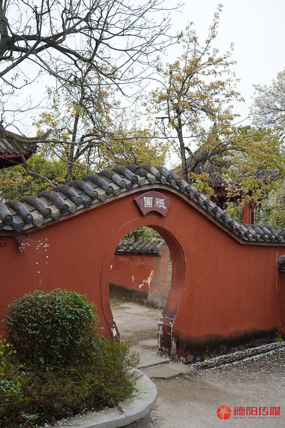 据记载,鹡鸰寺的梨树林已有两百多年历史。当年李调元读书时,这里便是“梨花如漫天飞雪一般,身形敏捷的少年穿行其中,时而吟诵诗词,时而在梨树下沉思”。如今,这些虬曲苍劲的老梨树向天空伸出枝丫,仿佛要刺破苍穹,与朱红古墙相得益彰,勾勒出独属于中式美学的诗意意境。