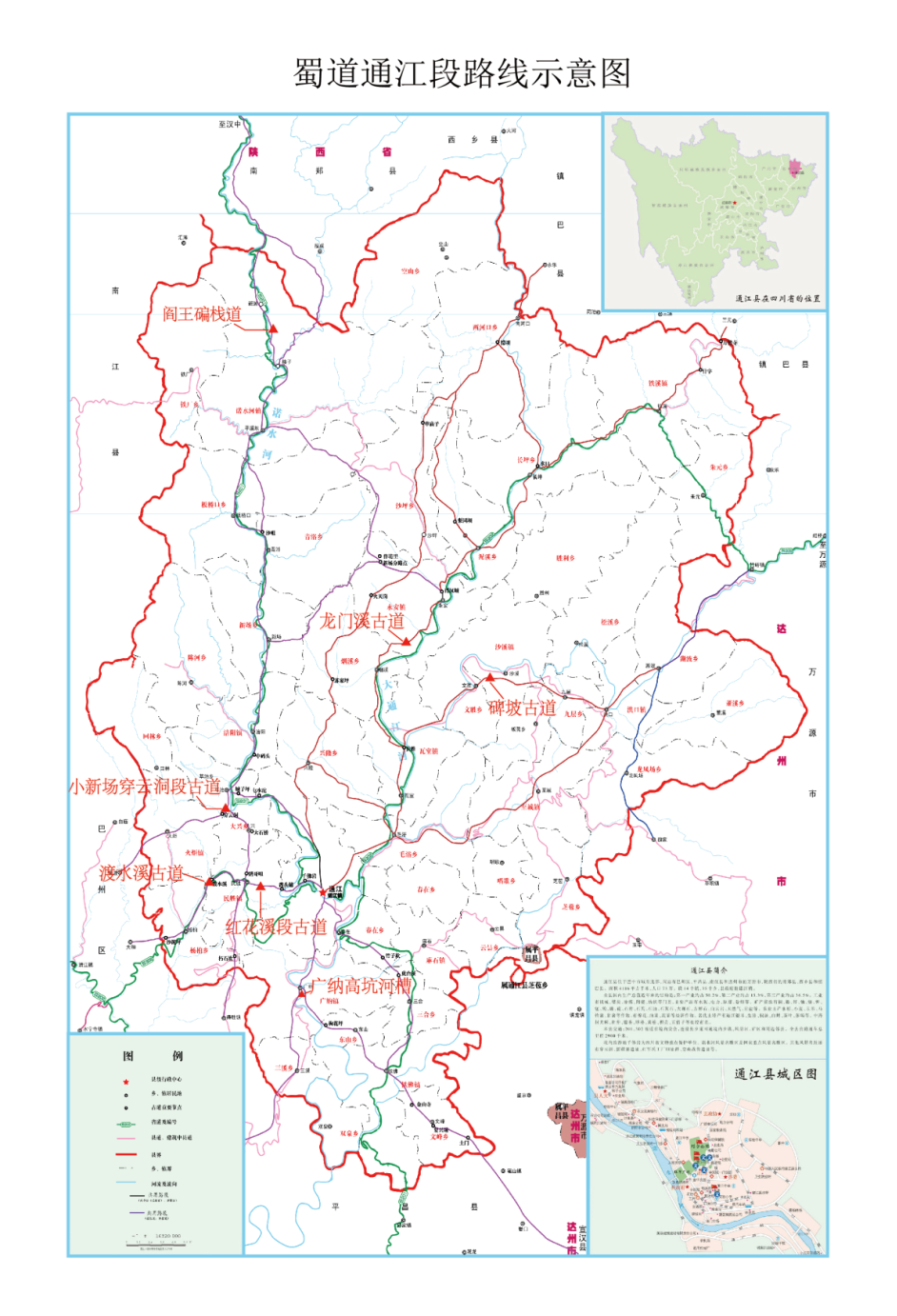 汉壁巴道连接陕西汉中与通江,洋壁巴道始于唐代,分东西两线穿通江而过,两线在境内交织成稳定交通走廊。沿线阎王碥栈道、千佛岩石窟、独善桥、穿云洞桥等遗存密集分布,实证古道工程体系完整、沿用时间长久。