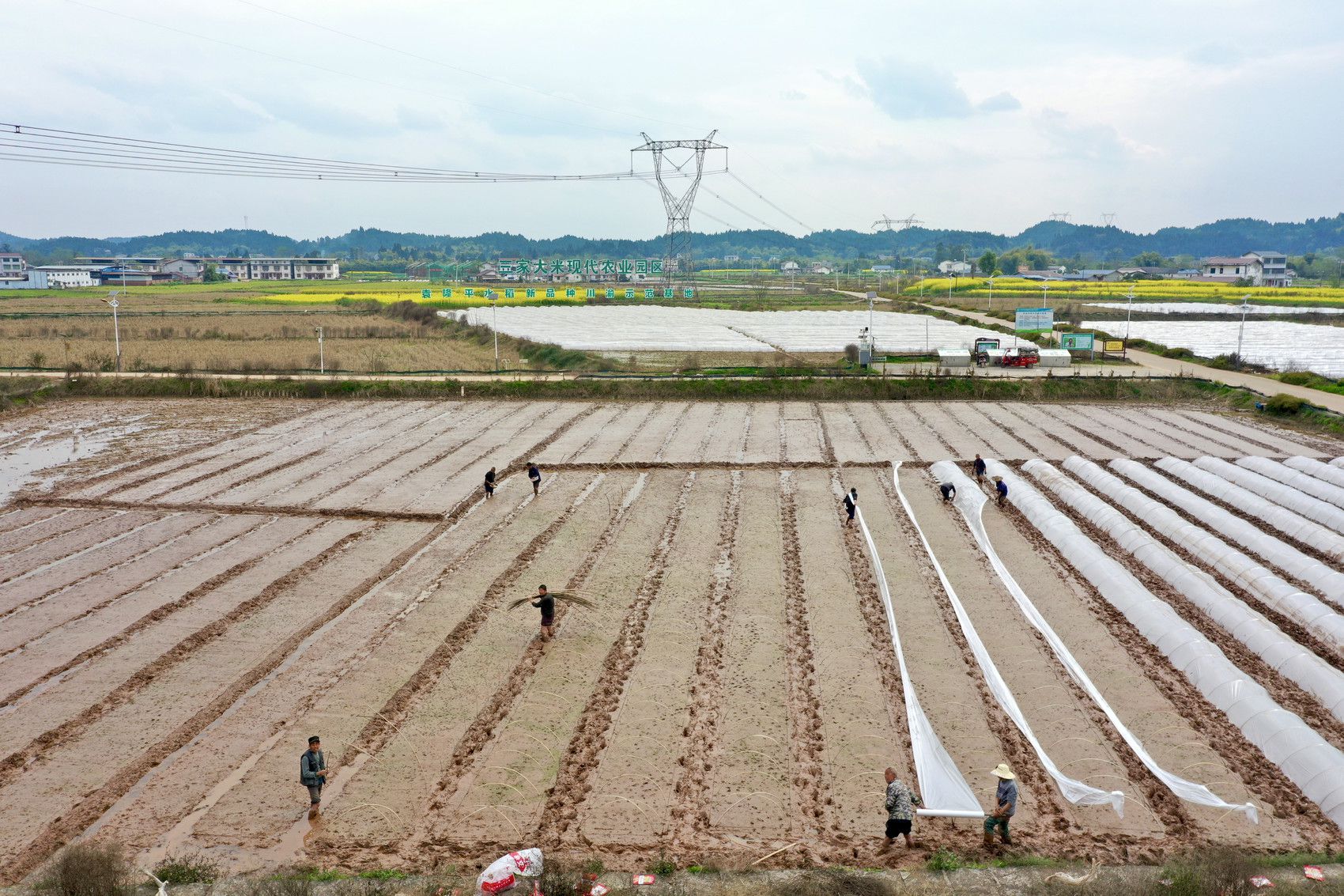 在安居区三家镇三门村则是另一番景象,这里是安居区三家大米现代农业园区核心区。站在田埂上望去,不少村民正在育秧。