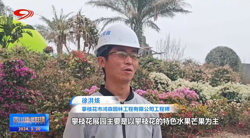 攀枝花市鸿森园林工程有限公司工程师 徐洪烗:攀枝花展园主要是以攀枝花的特色水果芒果为主,在主入口打造了一个芒果的巨型雕塑。整个园区以各色杂交的三角梅组成,形成“攀枝花是一座城,城是一朵花的理念。”