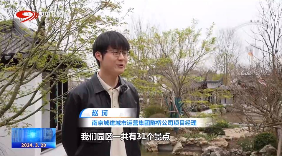 南京城建城市运营集团隧桥公司项目经理 赵珂:我们园区一共有31个景点,彰显的是南京的文学与历史,其中比较有特色的是凤凰台,其与园区主建筑遥相呼应,我们巧妙利用地势形成依山顺水的传统园林配置,其中有两棵我们从南京带来的特色苗木,金陵黄枫和骨里红。