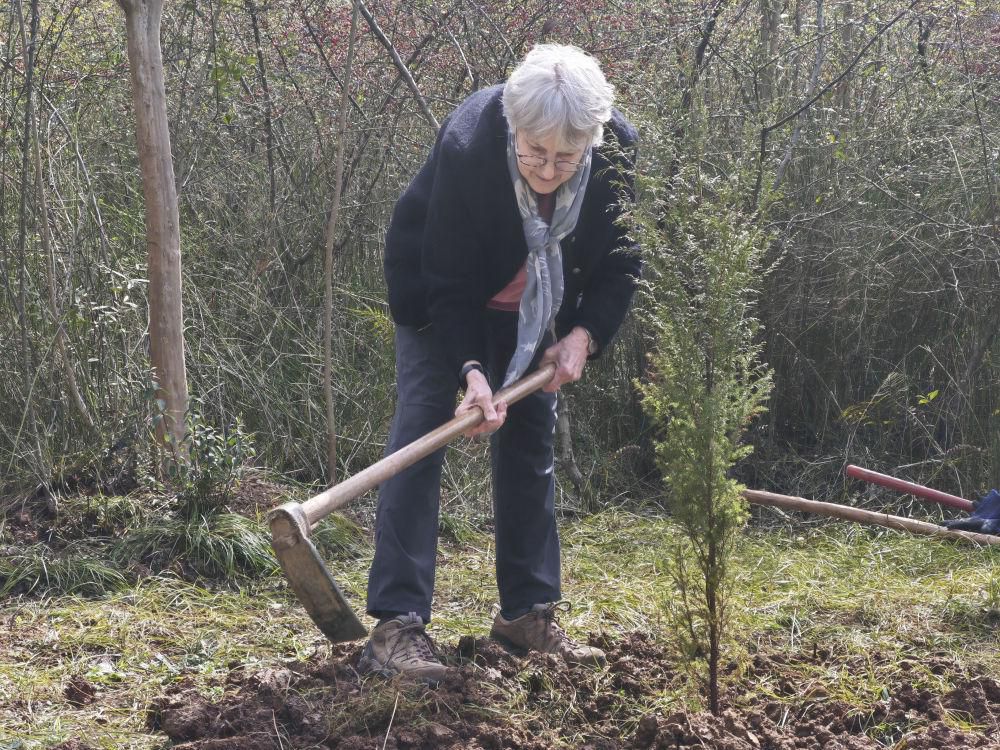 3月18日,81岁的美国女士贾和普在古蜀道上的翠云廊景区种下柏树苗。新华社记者 童芳 摄