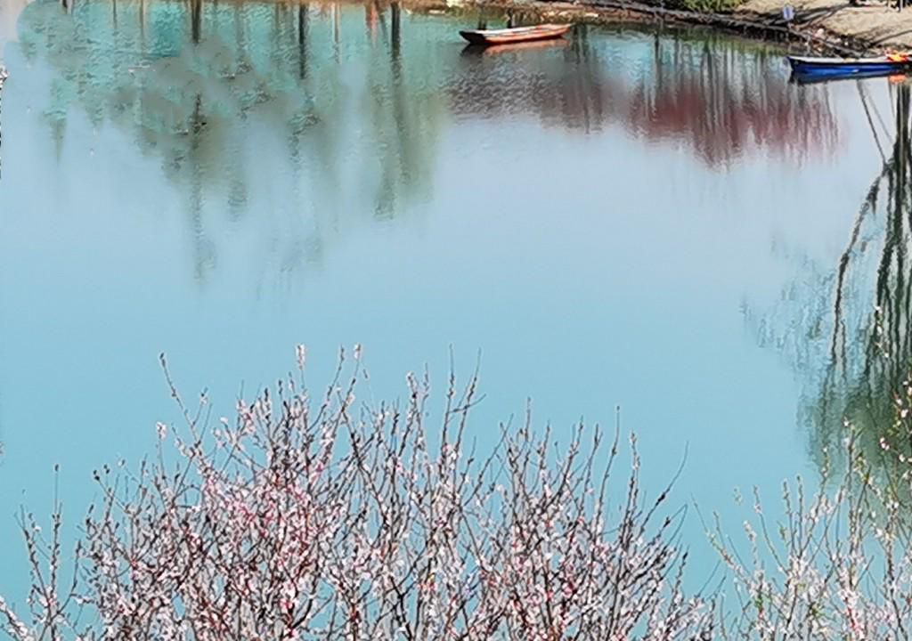 嫩绿的垂柳和粉红的桃花装点在湖畔,带来了满满的春意——在世园会摩诃湖,“云影天光映碧水”的意境已经呈现。