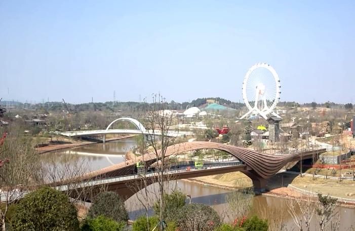 在世园会摩诃湖西北侧,只见一座竹编桥跃然其上。而竹编,也正是成都特色之一。“我们将竹编轻盈的形态和竹篾灵动的线条融入步行桥的形态设计中,将整个步行桥打造成绛溪河上的一个大型的竹编艺术品,进一步凸显成都特色的竹文化。”黄聪向记者介绍道。