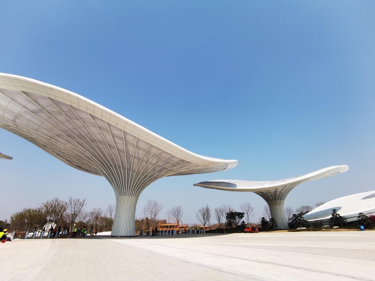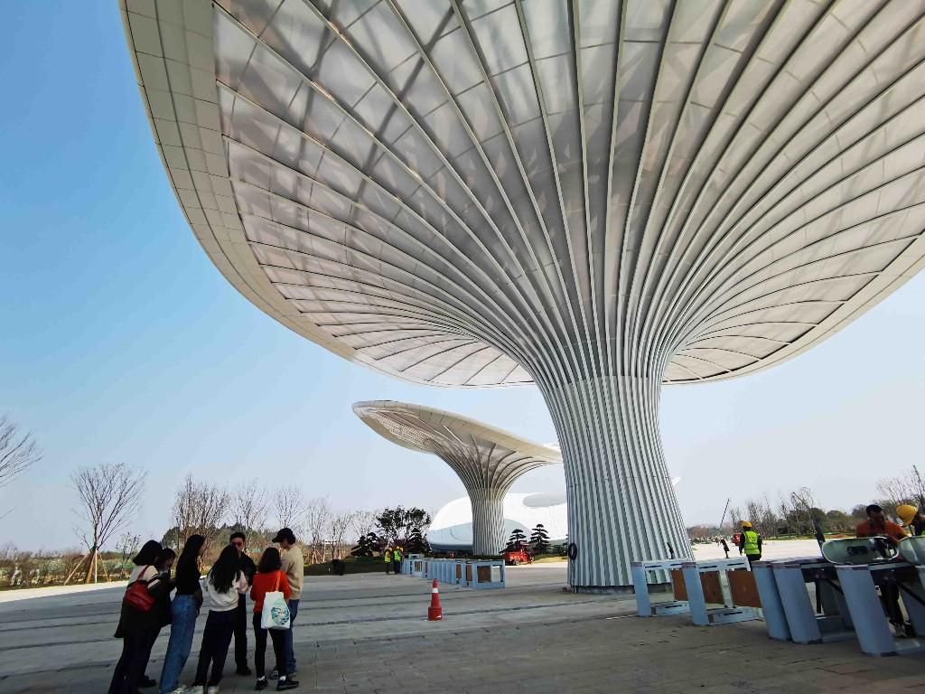 “对于主入口,我们提取了极具地域文化属性和门形概念的‘汉阙’,结合芙蓉花瓣的形状,形成现在呈现出来的样子。巨大的花瓣形成大伞,以大气磅礴的线条勾勒出海纳百川、喜迎四方宾朋的气魄,从此开启本届世园会的万千景象。”在黄聪的手指处,只见三个庞大的立柱仿佛撑开的花瓣,绽放在蓝天下。据介绍,“花瓣”由轻盈半透的膜材料构成,盛大节会期间将是夜景灯光秀的载体。