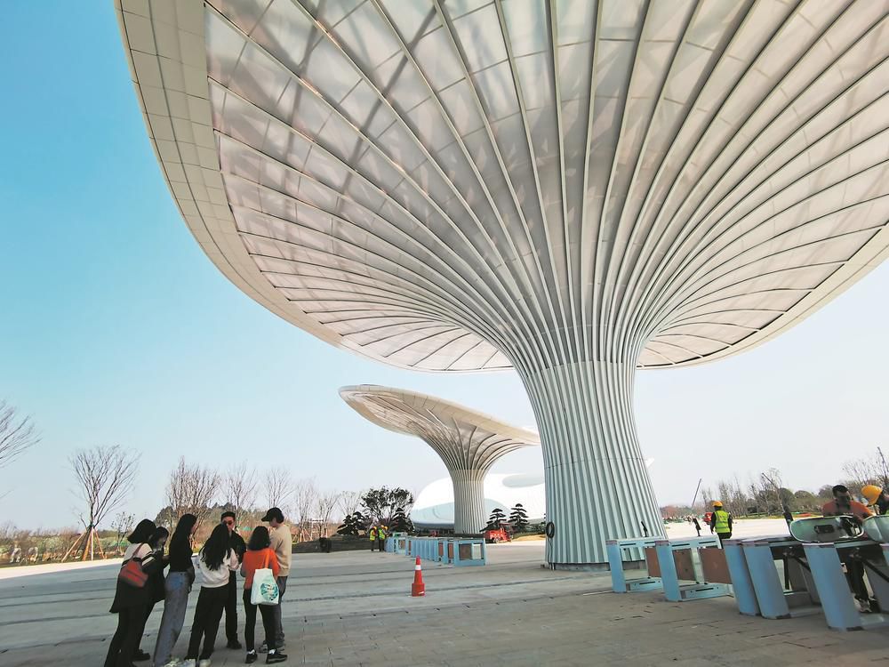 同样“暗藏玄机”的还有世园会主入口。这里矗立着三片巨大的“芙蓉花瓣”,最大的一片高达16米、最宽处达到53米。“这其实是一个雨水收集器。”项目总规划师黄聪告诉记者,雨水通过花瓣汇聚至中心,由直径250毫米的管道引入地下的雨水过滤储存系统中,“预计年收集雨水量约2500吨,可满足园区2公顷绿地的日常浇灌用水。”