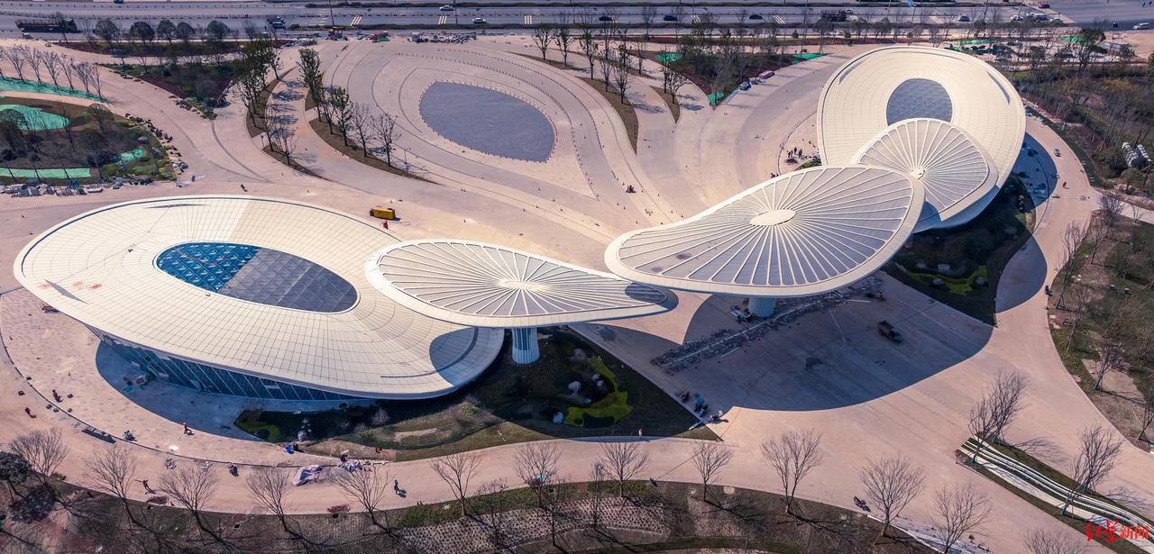 “道路、场馆、构筑物就像是茎秆和花瓣,当它们合在一起,才是一朵盛放的‘芙蓉花’。”在王睿的手指处,只见三个庞大的立柱仿佛撑开的花瓣,绽放在蓝天下,他介绍,这三座伞形构筑物以“汉阙”为设计灵感,构成了“芙蓉花开”的灵魂部分。