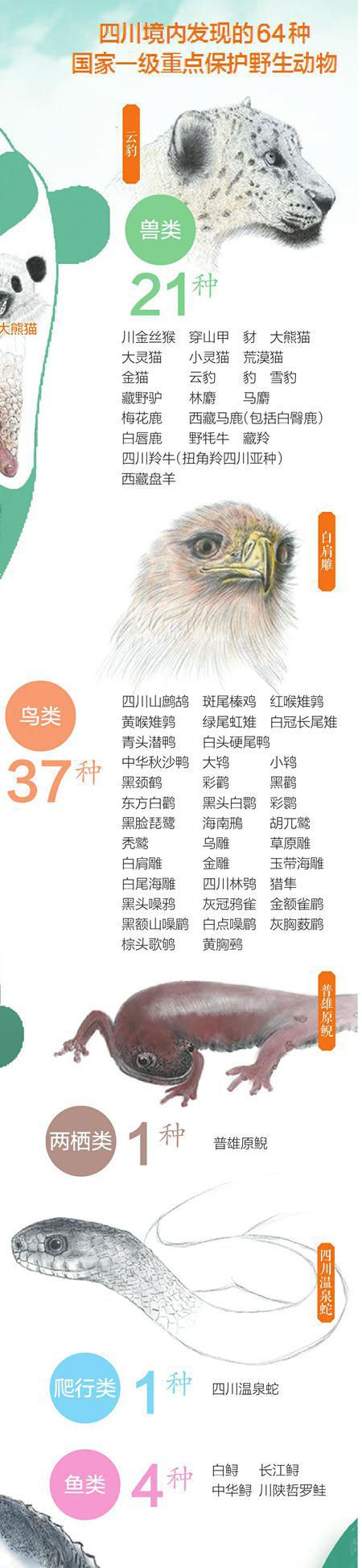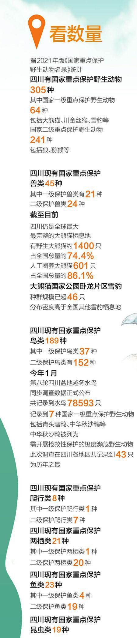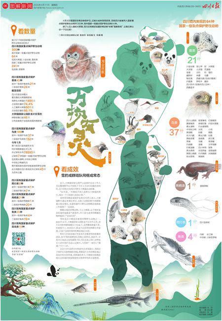 四川日报全媒体记者 陈俊伶 徐浩煊/文 朱濉/图 4月8日是国际珍稀动物保护日。记者从省林草局获悉,目前四川省被列入国家重点保护的野生动物共305种,其中国家一级重点保护野生动物64种。 除了人见人爱的大熊猫,四川还有哪些宝藏珍稀动物?本期“图解新闻”,让我们来认识一下它们吧!扫码看VR欣赏国家一级重点保护野生动物手绘“全家福” 来源:四川日报