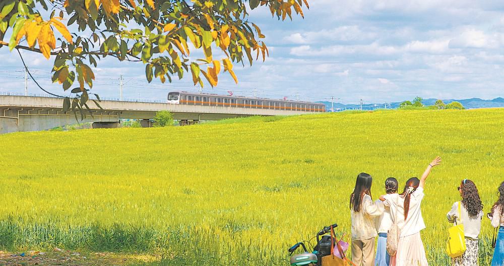 4月11日,成都龙泉驿区洪河村的环城生态区景观农田里,麦苗郁郁葱葱,不少市民在这里休闲玩耍。不远处的地铁高架桥上,向大面铺站开行的成都地铁2号线列车疾驰而过。主题为“公园城市 幸福成都”的2024世界园艺博览会即将在蓉举办,眼前的美景犹如给世园会平添一座“编外”展园。