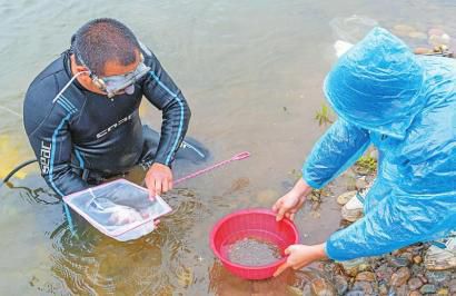 4月7日,中国水产科学研究院长江水产研究所科研人员潜水收集长江鲟鱼卵。 蔡磊 摄