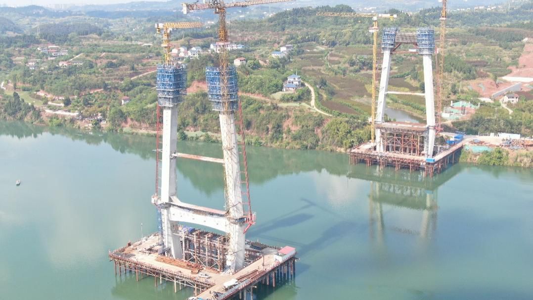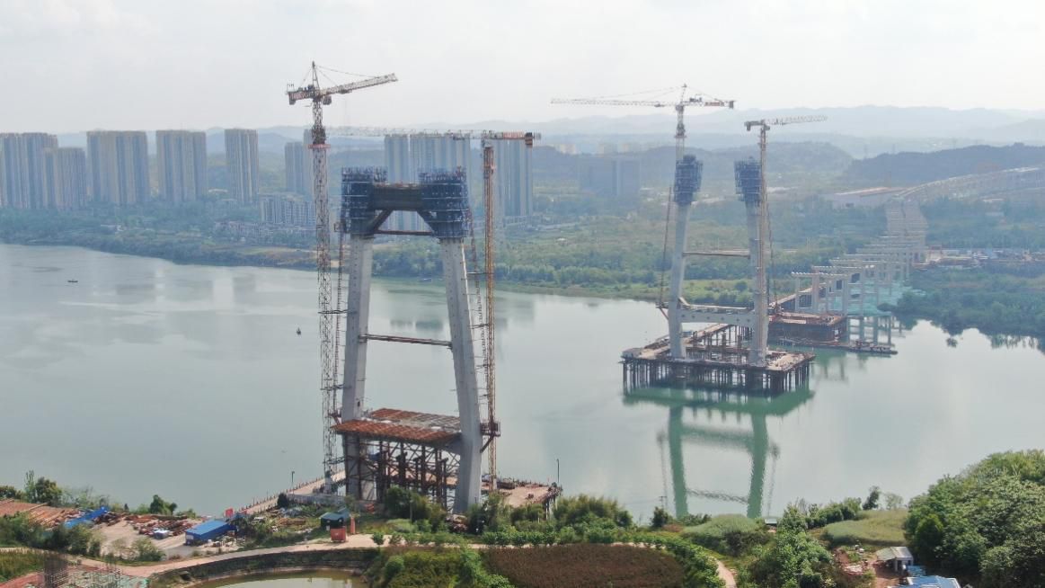 今日首座主墩索塔封顶的嘉陵江特大桥横跨南充市高坪区和嘉陵区,是一座全长2309米、半漂浮体系对称双塔双索面混凝土斜拉桥。大桥主塔采用花瓶型索塔造型,共21节段,高116.55米,约40层楼高。