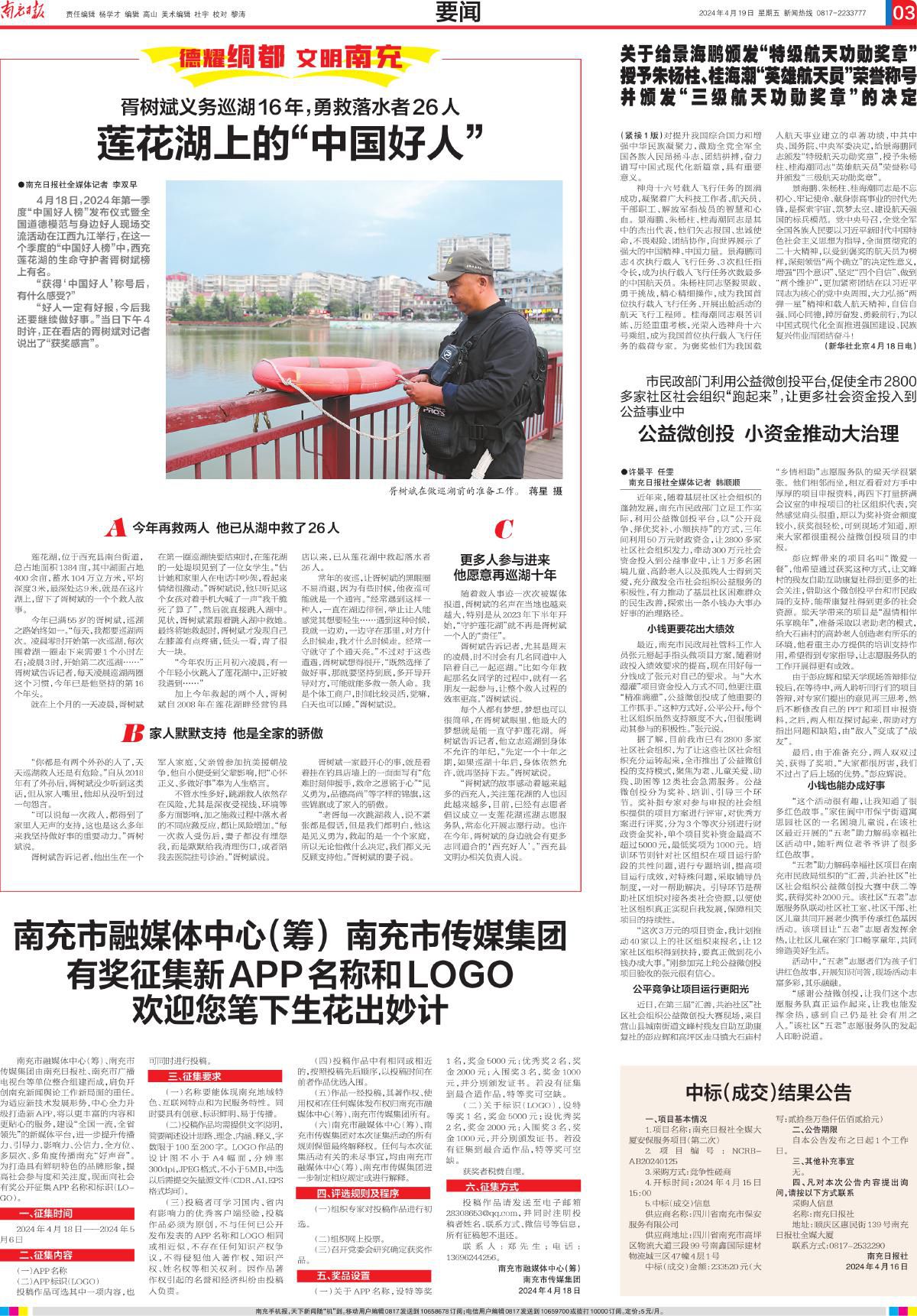 4月18日,2024年第一季度“中国好人榜”发布仪式暨全国道德模范与身边好人现场交流活动在江西九江举行,在这一个季度的“中国好人榜”中,西充莲花湖的生命守护者胥树斌榜上有名。