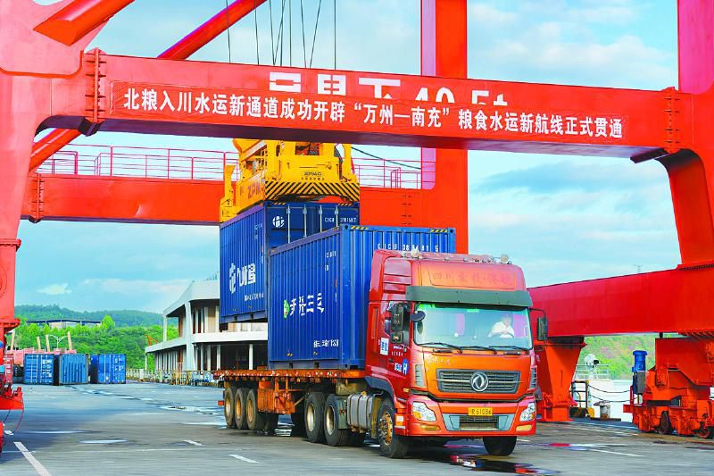 “13个粮食集装箱共装有400吨粮食,将由新通道物流公司旗下南充港以公路方式直接运抵南充双胞胎饲料有限公司。”据四川南充都京港务有限公司相关负责人董巍介绍,川渝共建的“万州—南充”粮食水上运输“保障线”正式贯通,也标志着南充港成功接入全国“北粮南运”水上大通道。公司加大在物流模式、运力调度、综合服务方面的创新,持续深化与长江、嘉陵江沿线各港口的“干支联动”,引导川东北数十万吨货物实现“公转水”,实现了货物种类、水运里程的多重突破,成功赋能嘉陵江水运高质量发展。
