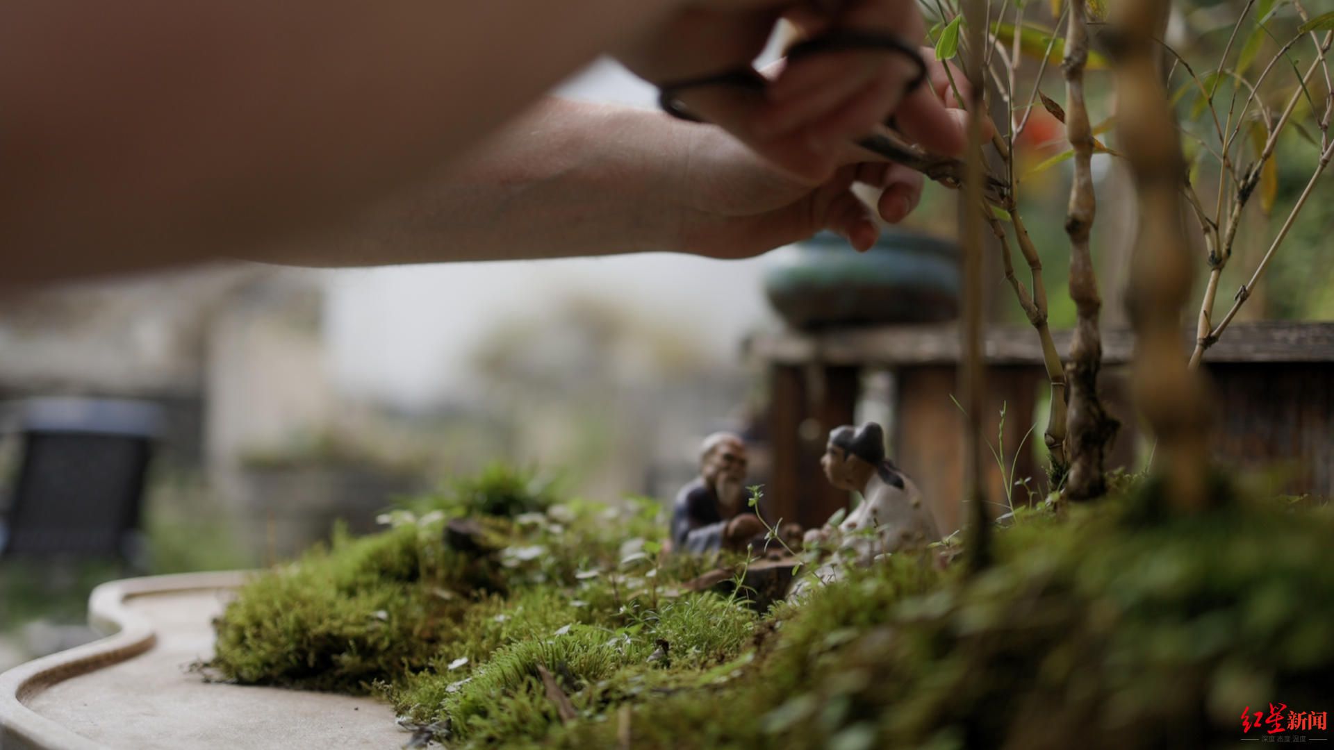 “竹子。”白熊说完,有些调皮地笑了笑。竹子是白熊最爱的植物,竹盆景也是他的创作重心。他告诉记者,盆景艺术中,竹子因其线条简洁、姿态优雅,常被用来营造清新脱俗、意境深远的景观。“它不是花,但在我心中如同花一样美好。”
