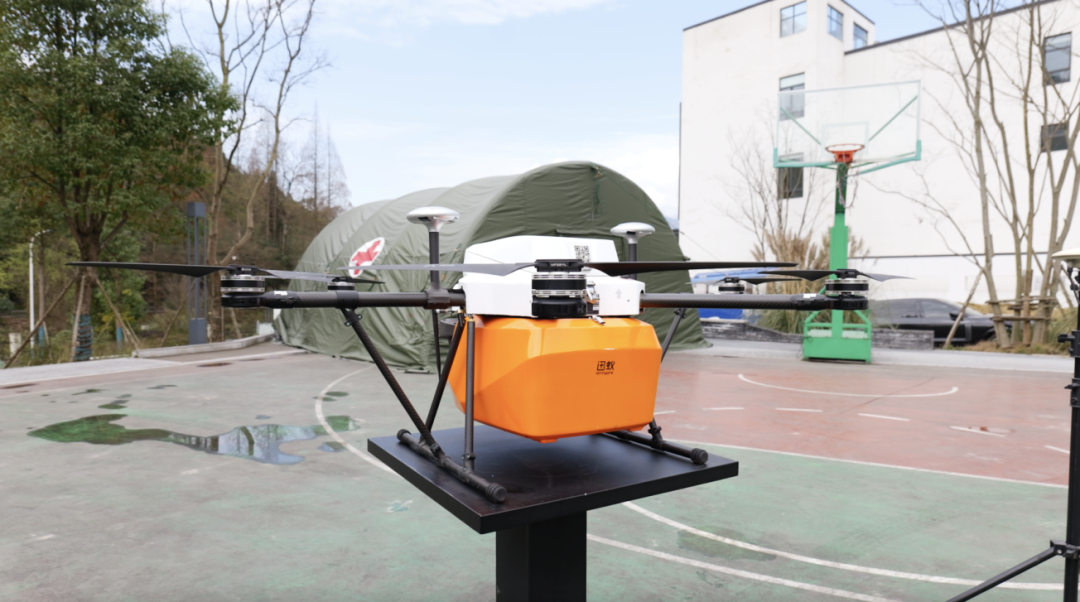 一架载着橘色小方盒的无人机缓缓降落