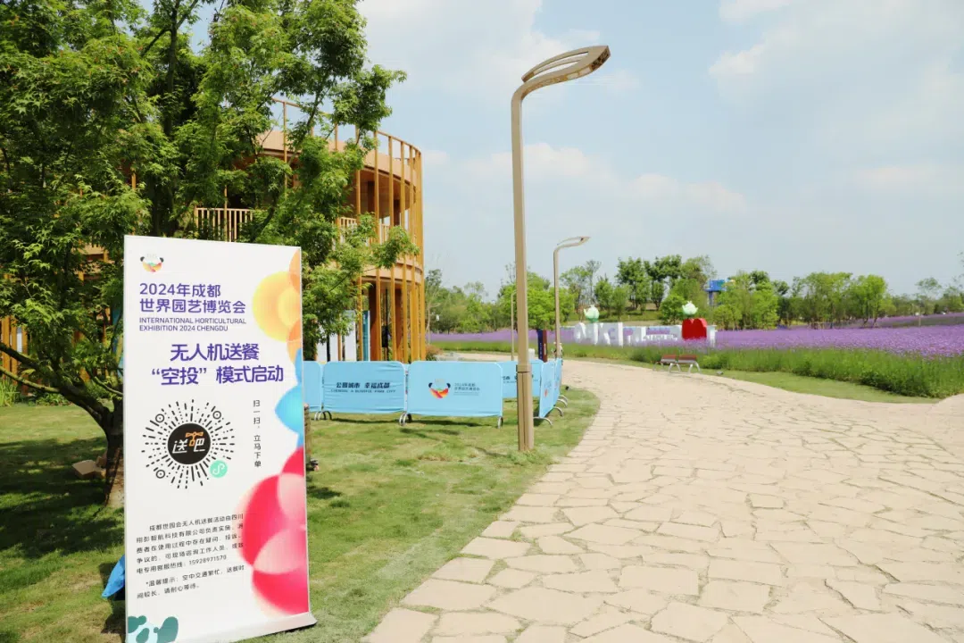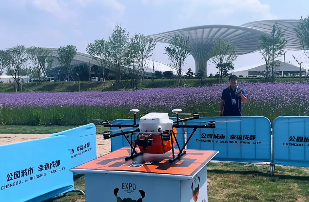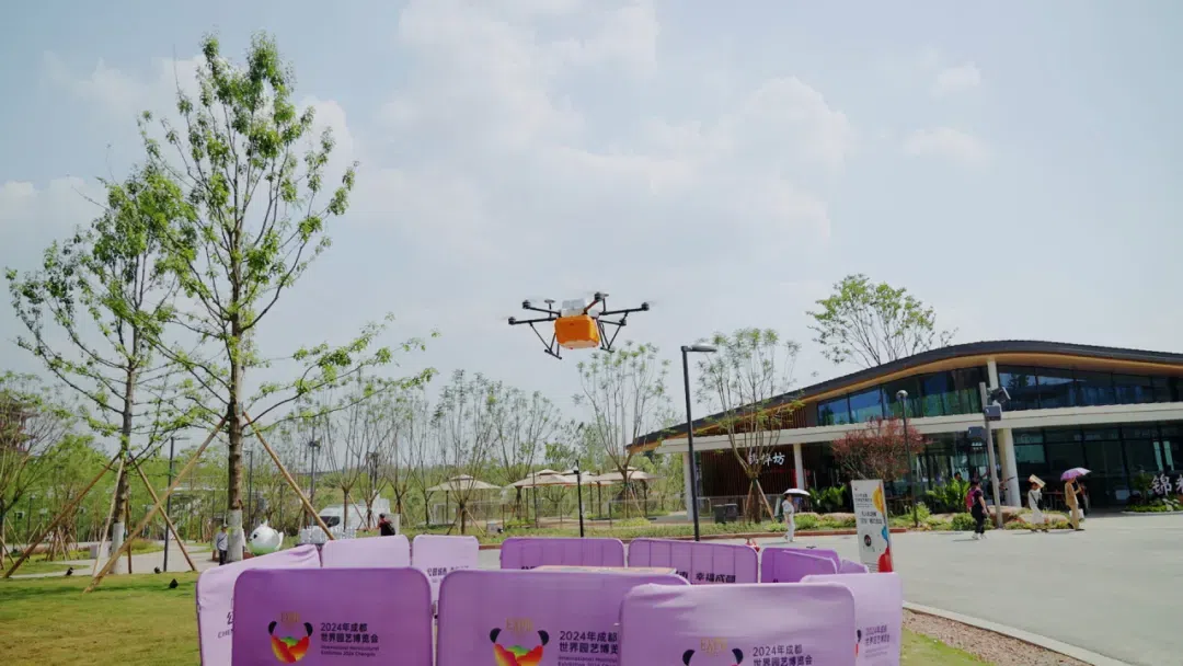 目前,世园会主会场设置了4条无人机配送航线,并在综合服务馆、蓉城时光街、天府人居馆、Woo童梦世园魔法森林区域规划了4个站点,无人机飞行高度约70米,在设计好的航线点位间直线飞线,园区内配送时间只需四五分钟。
