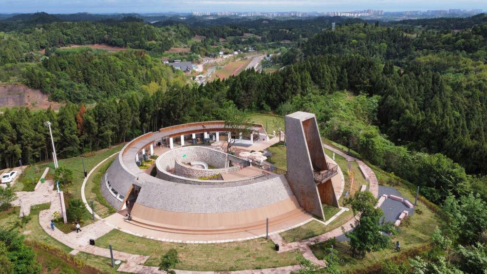 出生于2000年的重庆女孩柯雨是最早介入这个社区项目的运营人员。“正苦于寻找落地地点的时候,一张航拍图‘击中’了我。”照片中的位置正是仁里村山顶观景台,从高空看去,螺旋圆形的设计犹如一颗棒棒糖,将乡野气息与现代设计巧妙融为一体。