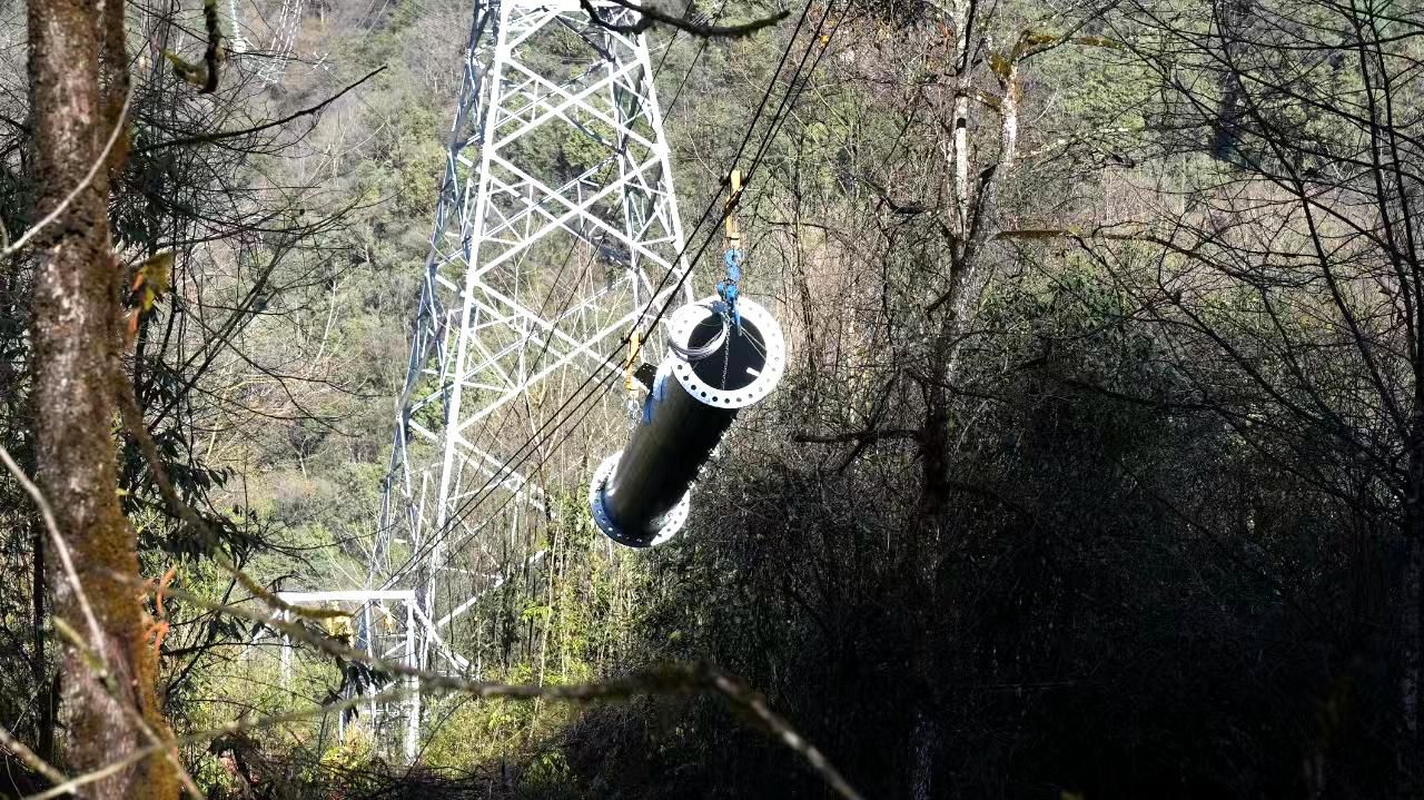 建设过程中,铁塔塔材通过重型货运索道进行运输。