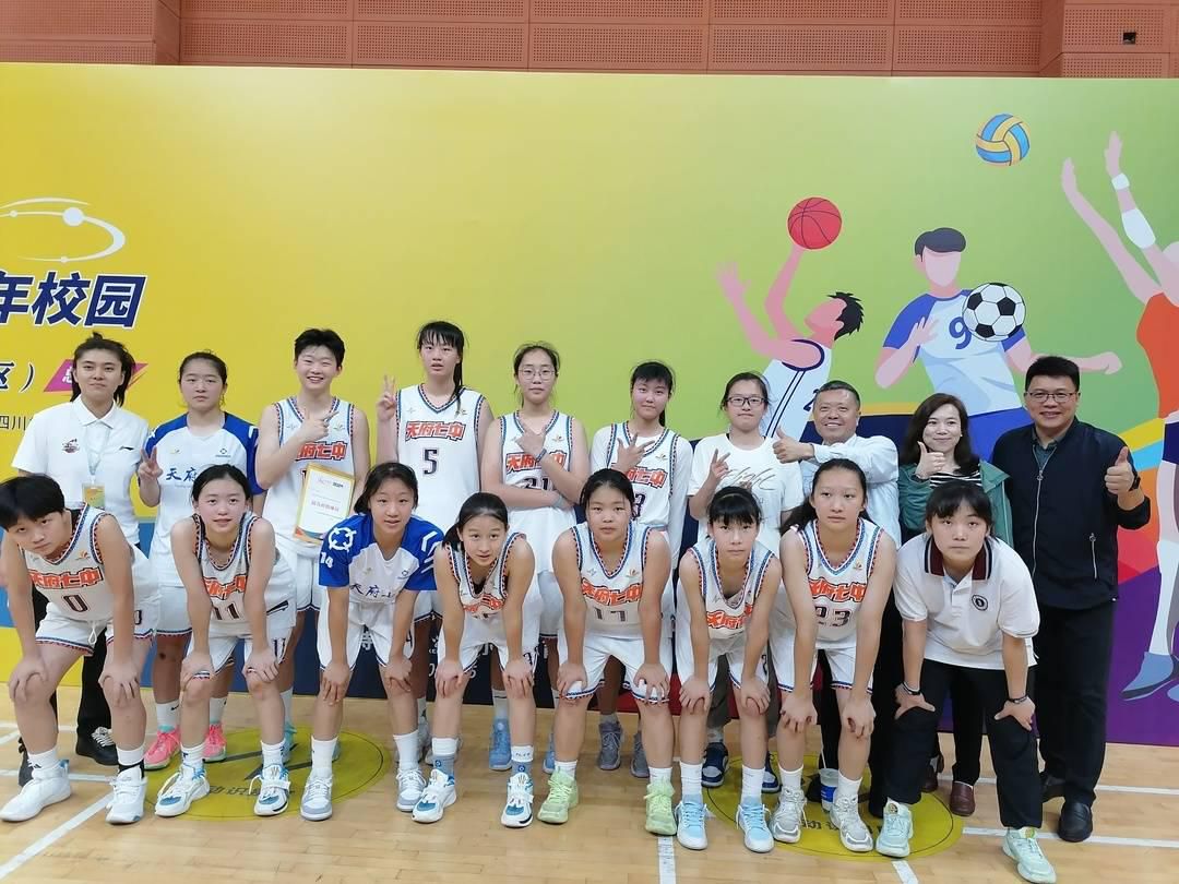 5月8日晚,14岁的周逸凡拿到了全场最具价值球员荣誉,她所在的天府第七中学初中女子篮球队以112∶56战胜对手。校长陈刚冲进球场,激动万分,女孩子们撩起外衣擦了把汗,兴奋地把矮他们一个个头的校长、教练老师们围住,来了个大合影。