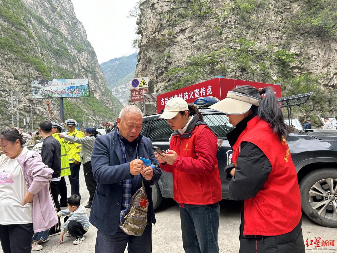 ▲古路村下,志愿者们在为游客服务。图据汉源融媒